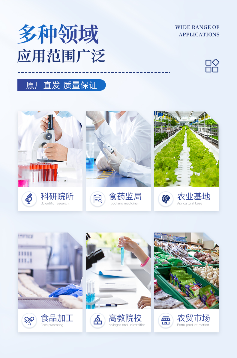 廣泛應(yīng)用于主要用于蔬菜、水果、茶葉、糧食、農(nóng)副產(chǎn)品等食品中有機(jī)磷和氨基甲酸酯類農(nóng)藥殘留的快速檢測(cè);此外還可用于果蔬茶生產(chǎn)基地和農(nóng)貿(mào)批發(fā)銷售市場(chǎng)現(xiàn)場(chǎng)檢測(cè),餐館、學(xué)校、食堂、家庭果蔬加工前的安全速測(cè)等。