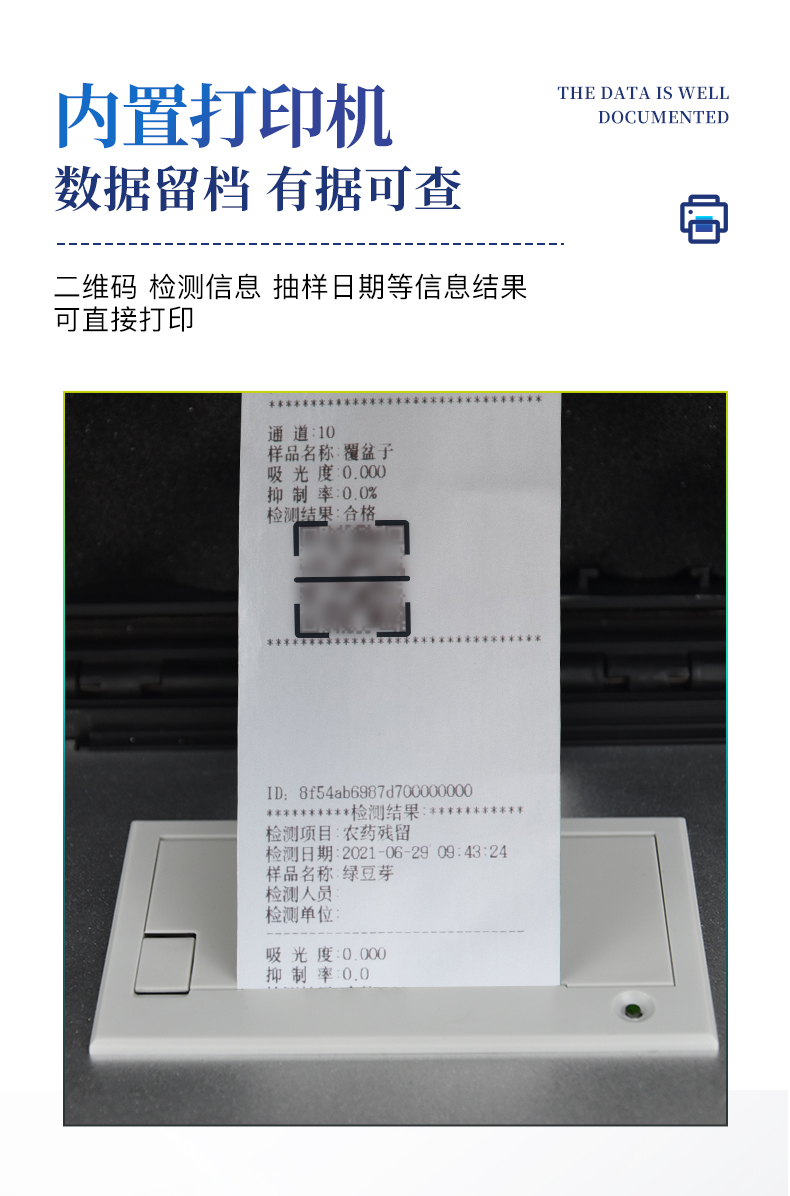 | 隨著人民生活水平的不斷提升,市場對茶葉的把控愈加嚴格。針對現(xiàn)狀,我司專門研發(fā)生產--茶葉專用的農藥殘留速測儀;定位茶農、茶商、茶葉企業(yè)使用。 此外還可用于果蔬茶生產基地和農貿批發(fā)銷售市場現(xiàn)場檢測,餐館、學校、食堂、家庭果蔬加工前的安全速測等。 | 檢測通道: 5個檢測通道,可以同時測試多個樣品,每個樣品由程序控制分別獨立工作,不會互相干擾。 | 顯示方式:≥5英寸液晶觸摸屏顯示,人性化中文操作界面,讀數(shù)直觀、簡單。 | 配備嵌入式高速熱敏打印機,可選擇手動打印或者自動打印,三分鐘出打印結果。 | 光源采用進口超高亮發(fā)光二極管,具有低功耗、穩(wěn)定性強、高靈敏度,高檢測精度,高重復性精度,光源可控、響應速度快等優(yōu)點。 | 采用標準USB接口設計,免驅動安裝,方便數(shù)據的存貯和移動,并可隨時與計算機直接相連,并且可用計算機控制儀器。實現(xiàn)數(shù)據查詢、瀏覽、分析、統(tǒng)計、打印等。 | 智能化程度高,儀器具有自檢功能:具有開機自檢和調零功能,具有自動檢測重復性功能 | 內置強大的數(shù)據庫,可在儀器上直接選擇樣品名稱、檢測指標、送檢單位等信息,也可在儀器上直接編輯錄入樣品名稱、檢測指標、送檢單位等信息并保存進樣品數(shù)據庫。 | 支持Wifi網絡,數(shù)據可局域網和互聯(lián)網數(shù)據上傳,檢測結果直接傳至食品安全監(jiān)管平臺。進行區(qū)域食品安全監(jiān)管及大數(shù)據分析處理,檢測區(qū)域食品安全長短期動態(tài),達到食品安全問題預估、預警 |