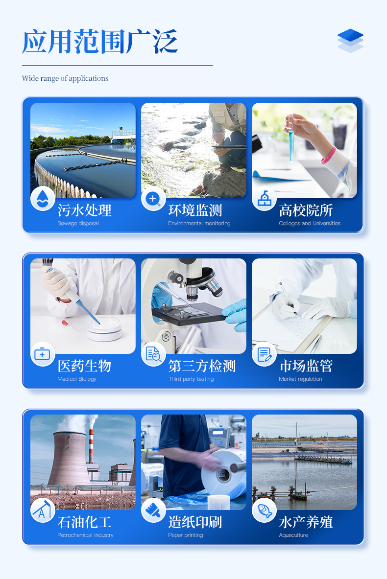能夠廣泛的應(yīng)用于各種行業(yè)(工業(yè)廢水、城市污水、生活污水及江湖流域地表水)廢水的檢測(cè),可適合不同用戶的多種需求,可在化工、石油、焦化、造紙、冶金、釀造、醫(yī)藥等工業(yè)廢水及各種生活污水監(jiān)測(cè)應(yīng)用。
