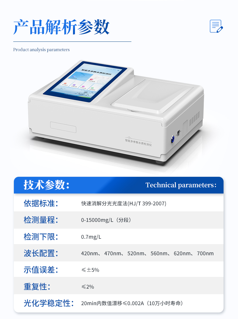 主要檢測(cè)COD、氨氮、總磷、總氮、磷酸根、硝酸鹽氮、總銅、銅、鉻、總鉻、鋅、總鋅、亞鐵、鎳、總鎳、錳、總錳、二氧化硅、總氯、余氯、鎘、鉛、鈦、釩、銀、鋁、硼、砷、錫、鈹、鋇、銻、汞、鈷、高錳酸鹽、硫酸鹽、氟化物、硫化物、氰化物、總氰化物、揮發(fā)性酚、苯胺、甲醛、甲醇、吊白塊、二氧化硫、雙氧水、濁度、色度、懸浮物、溶解氧、尿素、氰尿酸、亞硝酸鹽、臭氧、pH、二氧化氯等指標(biāo),兼具智能數(shù)據(jù)分析功能,圖表、列表顯示數(shù)據(jù),分析一目了然;高清晰度彩色液晶觸摸顯示屏,Android智能操作系統(tǒng),中文顯示界面,中英文鍵盤,人性化操作,使用更簡(jiǎn)單。