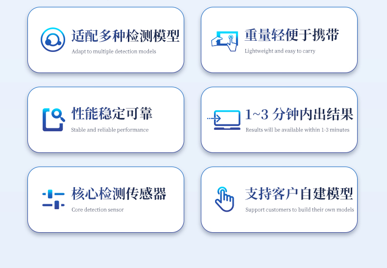 儀器重量輕體積小,既可作為實驗室檢測儀器,又可攜帶到田間地頭、生產(chǎn)一線實現(xiàn)快速檢測。儀器核心采用進口高性能光譜分析系統(tǒng),具有體積小、性能優(yōu)、穩(wěn)定性強等特點,檢測精度達到國際同類儀器水平。