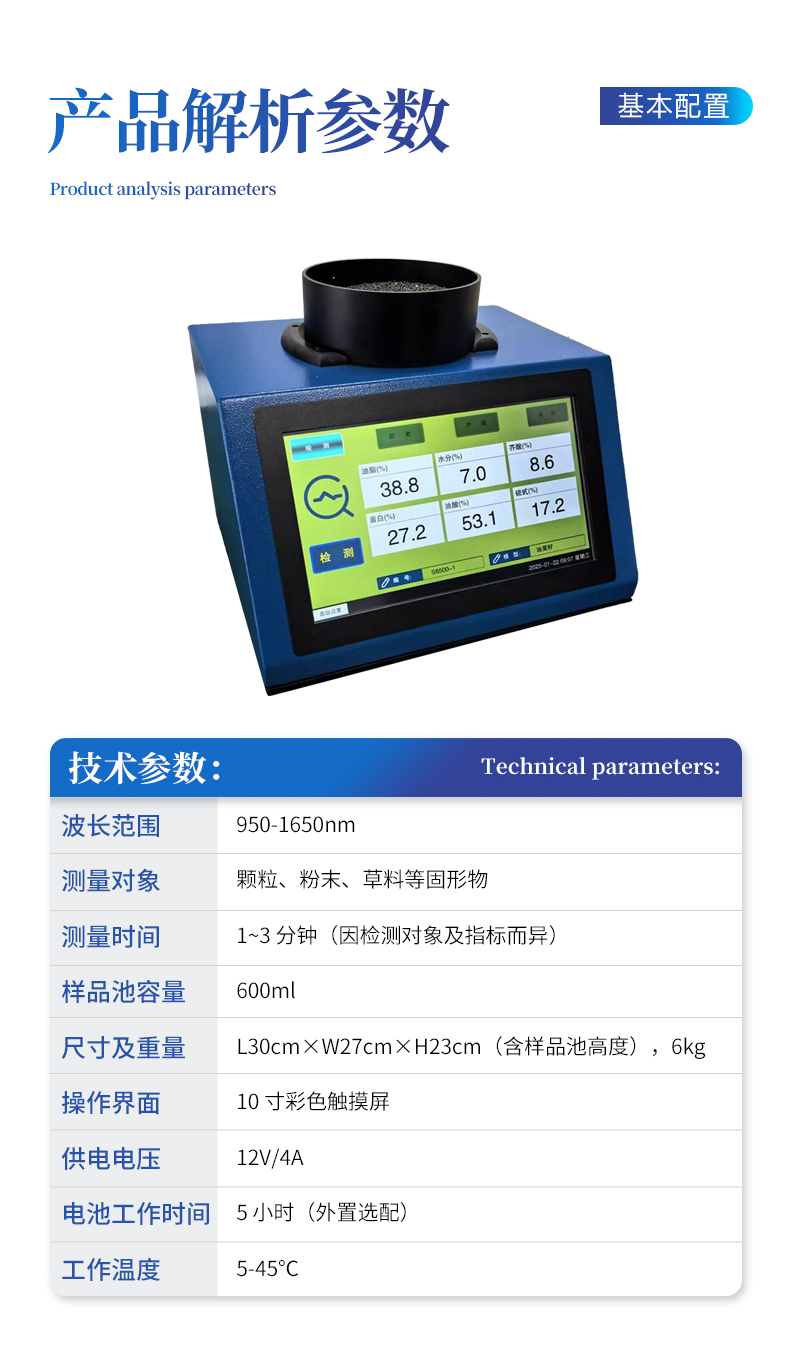 產(chǎn)品介紹: 產(chǎn)品介紹:近紅外光譜分析儀,是針對原糧、食品、飼料等行業(yè)開發(fā)的專用 檢測設(shè)備,可無損、快速、準(zhǔn)確地檢測樣本的水分、脂肪、蛋白質(zhì)等多種指標(biāo)。儀器重量輕體積小,既可作為實驗室檢測儀器,又···2026-02-23