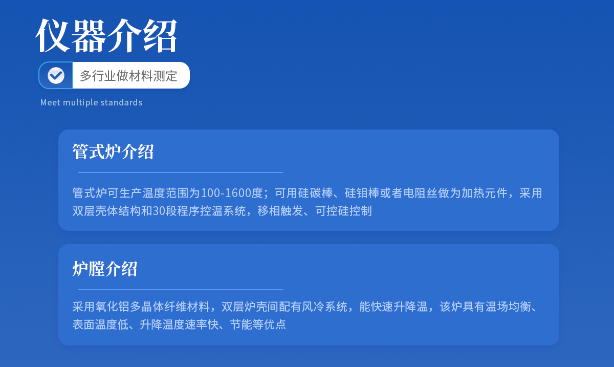 | 1、爐膛采用優(yōu)質(zhì)氧化鋁纖維材料,保溫性能好,耐用,拉伸強(qiáng)度高,無雜球,純度高,節(jié)能效果明顯; | 2、加熱元件采用優(yōu)質(zhì)HRE電阻絲,大大提高了其使用壽命; | 3、超溫報警,漏電保護(hù),操作安全可靠。 |
