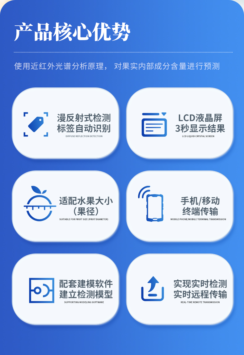 果實內(nèi)部品質(zhì)無損檢測儀,使用近紅外光譜分析原理, 對果實內(nèi)部成分含 量進(jìn)行預(yù)測。儀器由近紅外光譜儀、光源、處理器、顯示屏等組成。儀器光源發(fā)出近紅外光,使果實內(nèi)部的分子振動并發(fā)生能級躍遷,進(jìn)而產(chǎn)生近紅外光譜,因為近紅外光譜和果實品質(zhì)方面的成分含量具有相關(guān)性(如糖度、干物質(zhì)等),可通過數(shù)學(xué)算法建立相關(guān)品質(zhì)信息的預(yù)測模型,因此,在預(yù)測未知的水果樣品時,只需要使用無損檢測儀去掃描它,獲取它的光譜信息,即可通過模型提供該水果樣品的品質(zhì)預(yù)測結(jié)果。