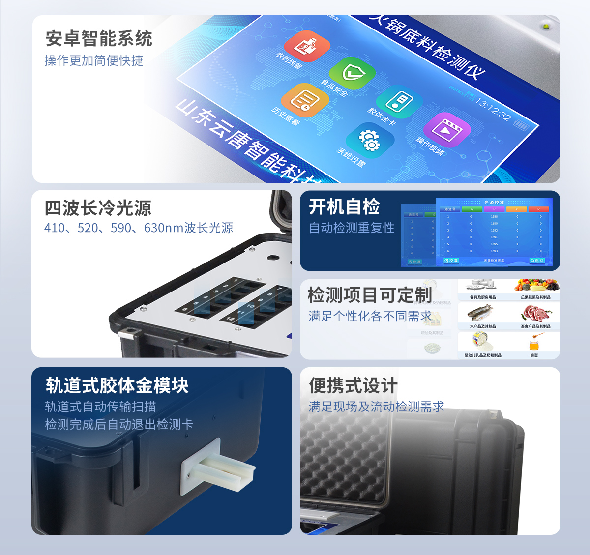 5、一體化便攜式快檢設(shè)備,滿足現(xiàn)場(chǎng)及流動(dòng)檢測(cè)使用需求,能夠在同一軟件下實(shí)現(xiàn)所有檢測(cè)項(xiàng)目的檢測(cè),并可通過同一窗口直觀顯示檢測(cè)結(jié)果。