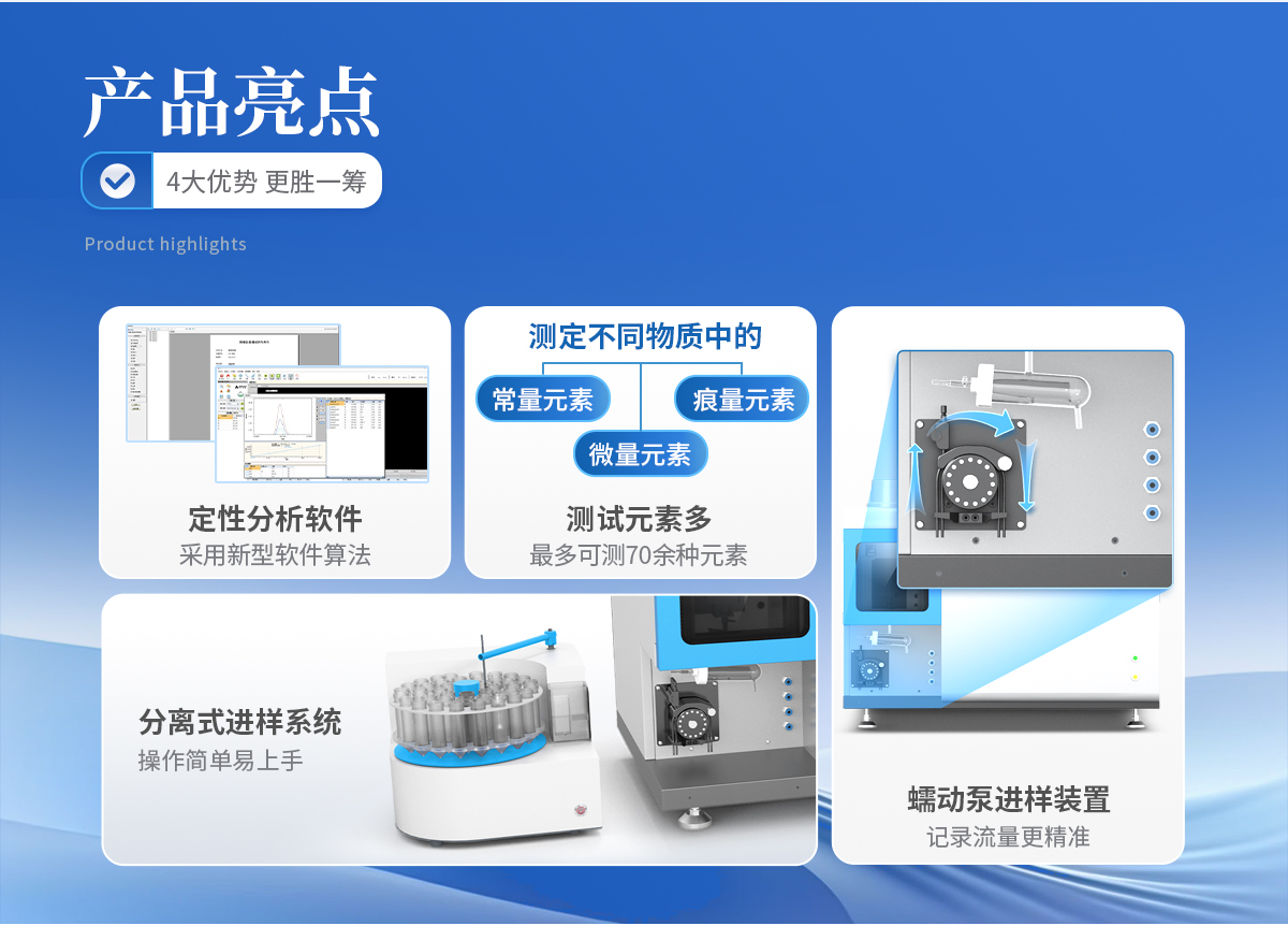 1、進樣系統(tǒng) 1.1 加長型霧室,保證高靈敏度的情況下有效降低背景噪聲,低記憶效應(yīng)。 1.2 **同心圓霧化器,霧化效率高、重復(fù)性好,記憶效應(yīng)弱,可直接自吸進樣。 1.3 快速拆卸式炬管,搭配自主研發(fā)的炬管工裝,可一秒實現(xiàn)炬管的準確定位,減少因更換 炬管帶來的位置誤差影響測試性能。 1.4 蠕動泵為 5 通道 16 滾軸全自動設(shè)計,蠕動泵轉(zhuǎn)速連續(xù)可調(diào)。確保穩(wěn)定進樣的同時,可 支持進樣、排廢、在線內(nèi)標和其他試劑進樣管(氫化物發(fā)生器)同時運行。 1.5 分腔體式進樣系統(tǒng),炬管和霧室在不同的空間內(nèi),減少炬管高溫對霧化的影響,也可以 直接觀察樣品的進行,便于實時排除異常情況。 1.6 多種類型的霧化器、霧室及炬管可選,可實現(xiàn)有機、高鹽、高靈敏、耐 HF 酸等不同進 樣需求,方便更換與維護。 1.7 集成氣路全自動控制,采用精密質(zhì)量流量控制器控制多路氣體流量,精度 0.01L/min。 1.8 缺氣氣保護功能,儀器在氣源耗盡的情況下自動熄火,并通過嗡鳴器實時發(fā)出報警聲音。 1.9 火焰視頻監(jiān)測,儀器配置了靈敏度高的火焰?zhèn)鞲邢到y(tǒng),以及可視化視頻監(jiān)測攝像頭, 可以實時觀測燃燒室火焰狀態(tài),并在熄火時自動關(guān)閉射頻電源,保護儀器重要部件。 1.10 可視化的儀器運行狀態(tài)監(jiān)控模塊,可對儀器各組成部件的運行情況進行監(jiān)測,判斷故 障原因,便于各部件的正常運行。