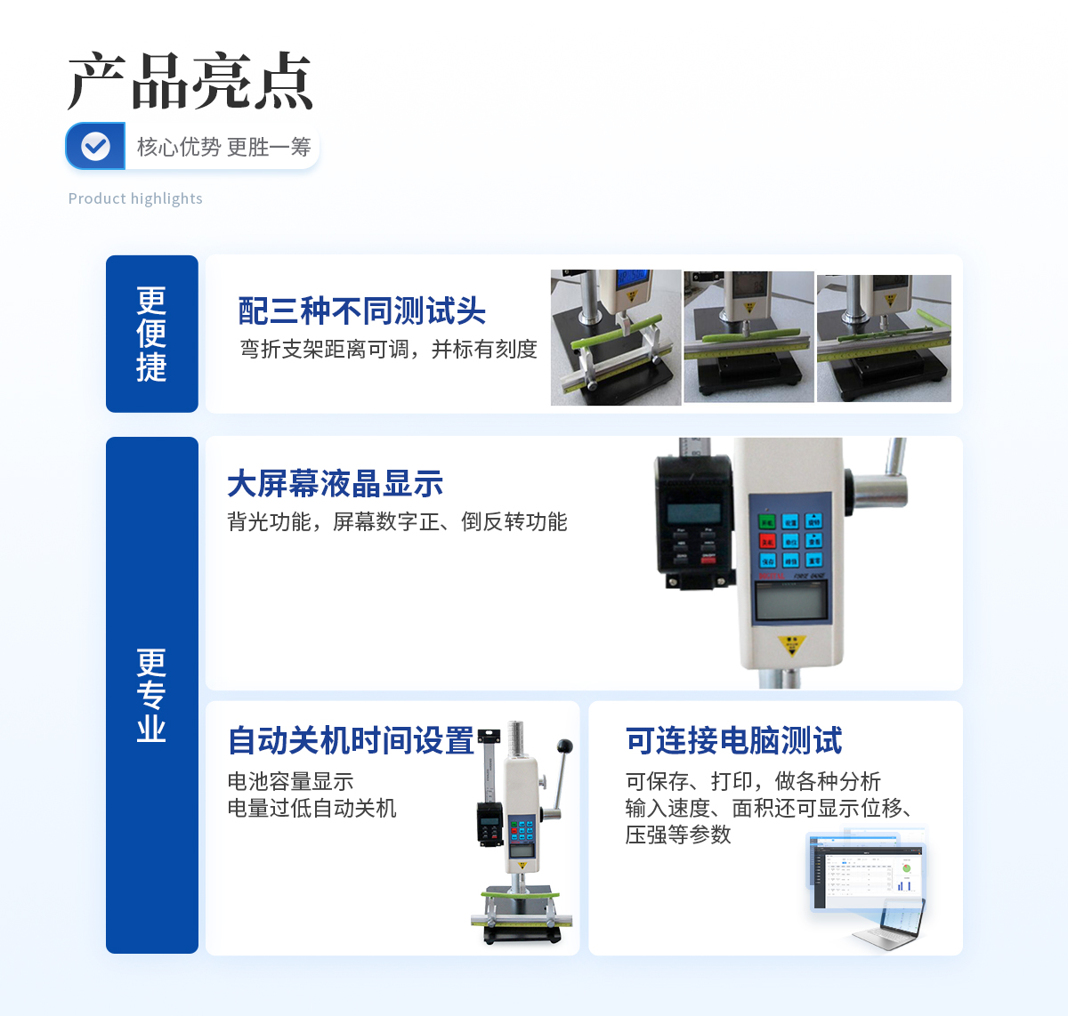 | 1、三種不同測(cè)頭:可進(jìn)行莖桿彎折性能測(cè)量、莖稈抗壓強(qiáng)度測(cè)量、莖桿組織結(jié)構(gòu)(穿刺)強(qiáng)度測(cè)量;彎折支架距離可調(diào),并標(biāo)有刻度。 | 2、可配測(cè)位移標(biāo)尺 | 3、可連接電腦測(cè)試,可保存、打印,做各種分析,輸入速度、面積還可顯示位移、壓強(qiáng)等參數(shù); | 4、可儲(chǔ)存999個(gè)測(cè)試值; | 5、大屏幕液晶顯示,有背光功能,并具有屏幕數(shù)字正、倒反轉(zhuǎn)功能; | 6、自動(dòng)關(guān)機(jī)時(shí)間設(shè)置; | 7、電池容量顯示,電量過(guò)低自動(dòng)關(guān)機(jī)。 |