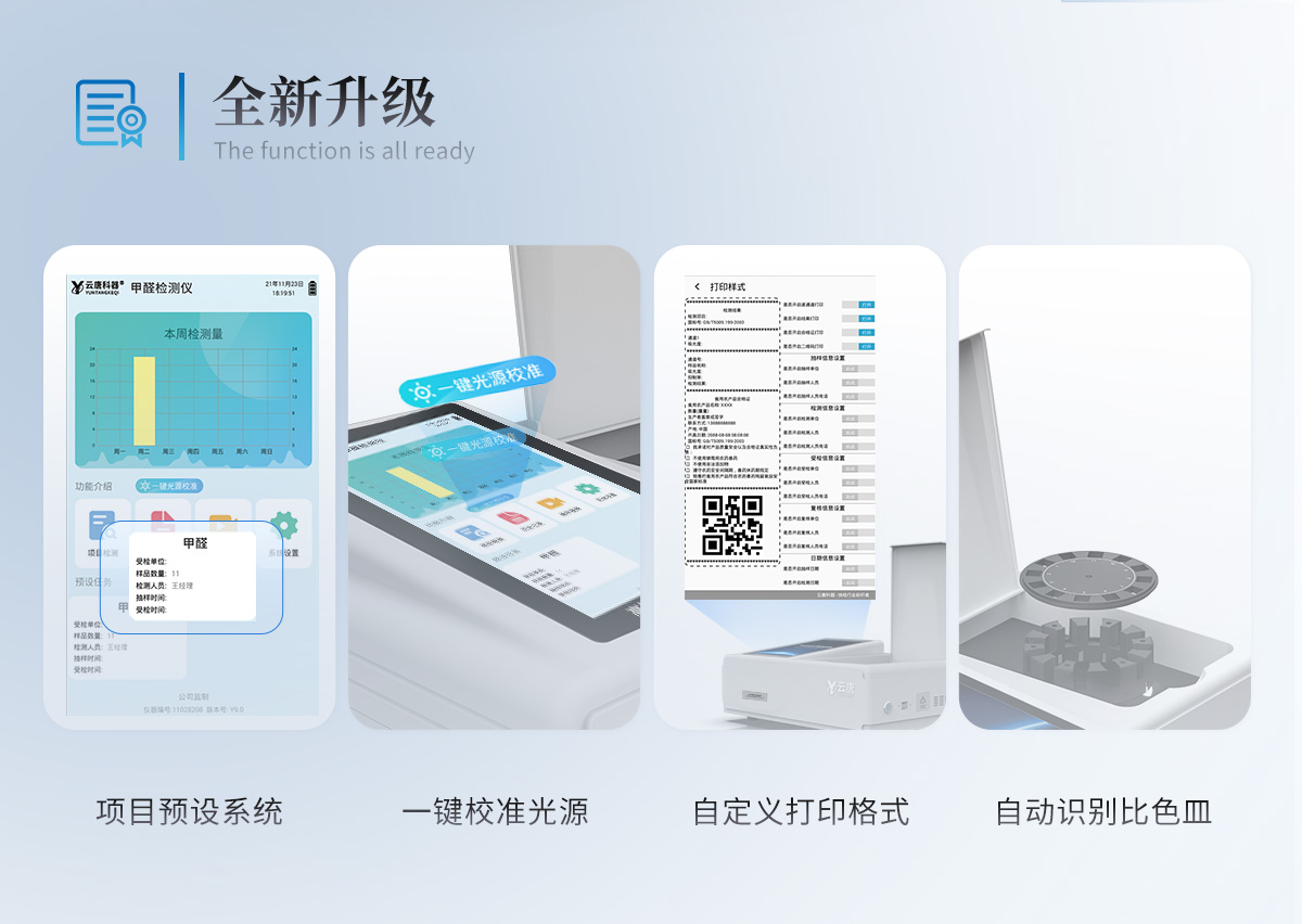 可快速定量檢測各類食品中的甲醛的含量,儀器預(yù)留其他項(xiàng)目檢測程序和端口,根據(jù)日后需求可方便的自主增加檢測項(xiàng)目。日后可升級為檢測,水產(chǎn)品,肉制品,面制品的綜合類型儀器。