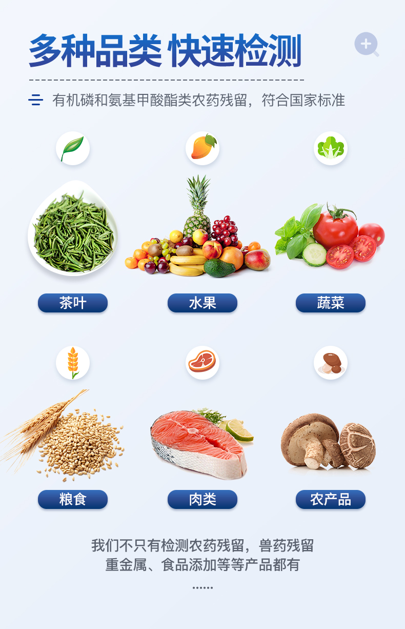 檢測(cè)標(biāo)準(zhǔn):依據(jù)國(guó)家標(biāo)準(zhǔn)方法(GB/T5009.199-2003)以及世界衛(wèi)生組織WHO、世界糧農(nóng)組織FAO殘留農(nóng)藥檢測(cè)標(biāo)準(zhǔn)、世界環(huán)境保護(hù)局EPA參照攝入量等要求來(lái)設(shè)計(jì)。采用酶抑制率比色法對(duì)水果、蔬菜等農(nóng)林產(chǎn)品中有機(jī)磷和氨基甲酸酯類農(nóng)藥含量進(jìn)行快速準(zhǔn)確的檢測(cè),乙酰膽堿酯酶和丁酰膽堿酯酶試劑均可以使用,符合國(guó)家標(biāo)準(zhǔn)和農(nóng)業(yè)部標(biāo)準(zhǔn)的要求。