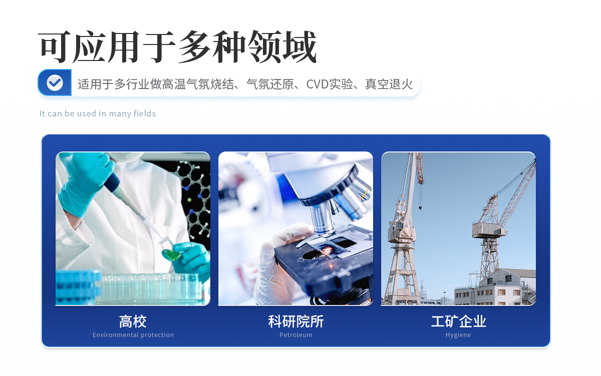 用于高校、科研院所、工礦企業(yè)做高溫氣氛燒結(jié)、氣氛還原、CVD實驗、真空退火等。具有溫場均勻、升降溫速率快、節(jié)能、可通入多重氣體等特點。