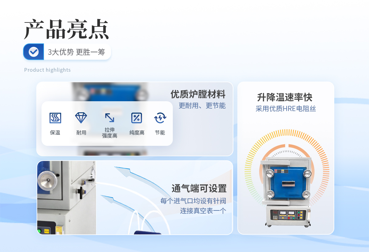 | 1、爐膛采用優(yōu)質(zhì)氧化鋁纖維材料,保溫性能好,耐用,拉伸強度高,無雜球,純度高,節(jié)能效果明顯; | 2、加熱元件采用優(yōu)質(zhì)HRE電阻絲,大大提高了其使用壽命; | 3、超溫報警,漏電保護,操作安全可靠。 |