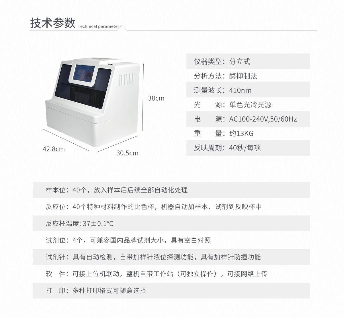 | 波長配置:410 | 試 劑 針:3根 | 檢測通道:20個(gè) | 反應(yīng)溫度:37℃,儀器具有自動加溫溫控系統(tǒng) | 觸 摸 屏:7寸觸摸屏,可單機(jī)操作 | 比 色 皿:容量 0 - 4.5ml | 試 劑 盒:配套試劑存放盒,可整體取出 | 清洗功能:可自動清洗試劑管路,避免試劑污染 | 加樣功能:儀器按照試劑要求自動、按時(shí)、按量加入試劑,提高工作效率 | 自動混勻:儀器測試過程中自動震蕩混勻保證試劑充分反應(yīng) | 實(shí)時(shí)監(jiān)控:儀器測試過程中顯示實(shí)時(shí)運(yùn)行狀態(tài) | 打印功能:內(nèi)置熱敏打印機(jī),可快速打印檢測結(jié)果,方便數(shù)據(jù)留存 | 數(shù)據(jù)存儲:大容量存儲器,能存儲12萬條數(shù)據(jù) | 數(shù)據(jù)接口:外接USB接口,網(wǎng)線接口 | 網(wǎng)絡(luò)連接:可連接有線網(wǎng)絡(luò)和無線wifi | 上位機(jī)軟件:儀器配套電腦端上位機(jī)軟件,可通過軟件進(jìn)行寫入?yún)?shù)及讀取數(shù)據(jù) | 樣本檢測:儀器自動對未正常放置的樣本或異常的樣本進(jìn)行檢查并報(bào)警提示 | 試劑檢測:儀器測試前和測試過程中時(shí)刻對試劑進(jìn)行檢查,檢查試劑是否缺失,如有異常儀器會進(jìn)行報(bào)警提示,對已經(jīng)加入試劑的樣本進(jìn)行正常測試,不影響測試結(jié)果,對未測試的樣本停止測試。 | 數(shù)據(jù)上傳:儀器數(shù)據(jù)可傳入電腦端,按照客戶需求進(jìn)行保存或打印 | 儀器重量:約7KG | 儀器尺寸:410mm*290mm*202mm |