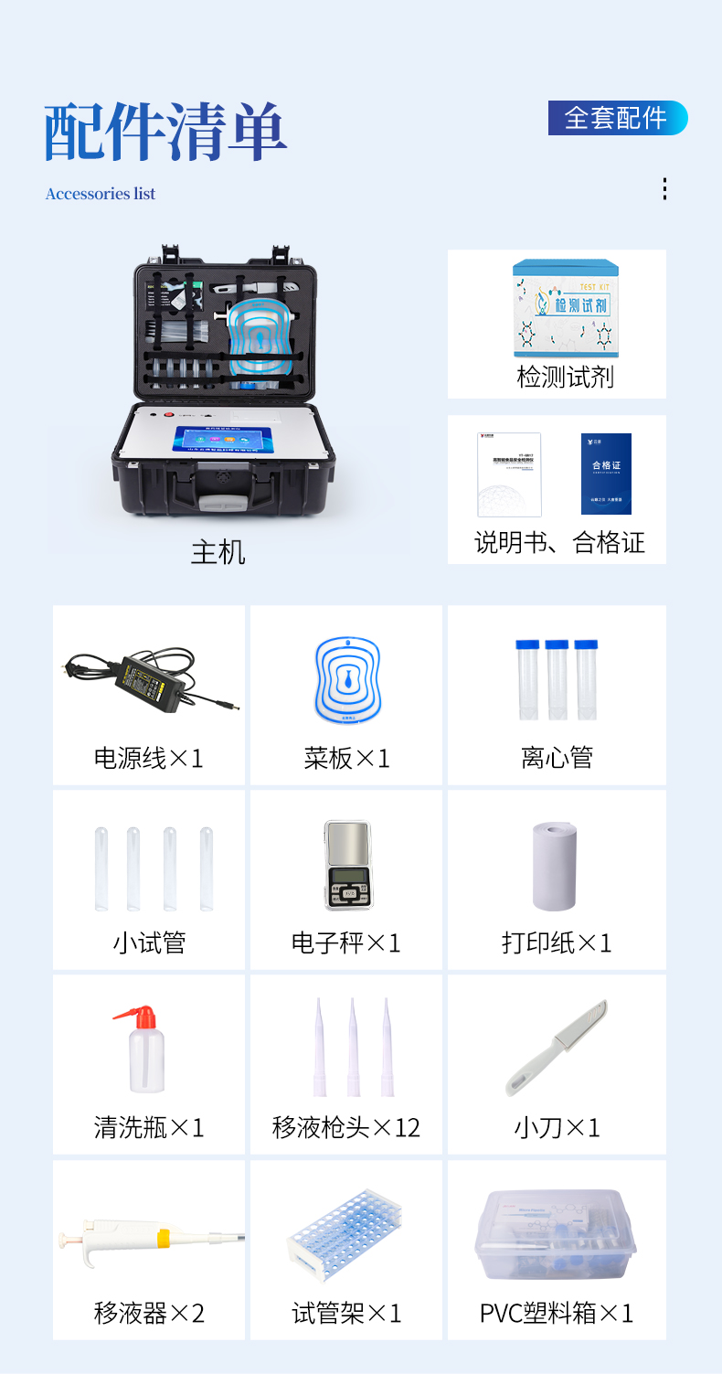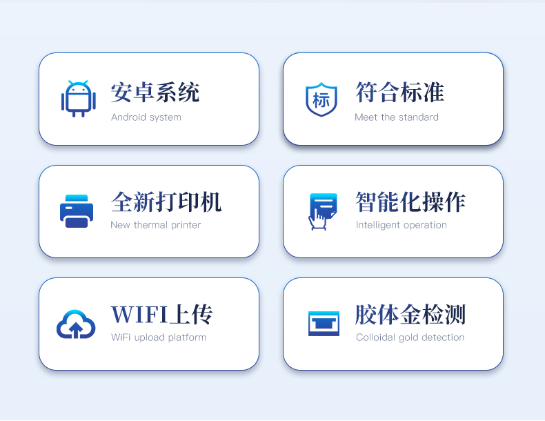 | 安卓智能操作系統(tǒng),采用更加**UI交互界面,儀器具有wifi聯(lián)網(wǎng)上傳、4G聯(lián)網(wǎng)傳輸、GPRS無線遠(yuǎn)傳、網(wǎng)線連接功能,快速批量上傳數(shù)據(jù)。 | 智能化程度高,儀器具有自檢功能:具有開機(jī)自檢和調(diào)零功能,具有自動(dòng)檢測重復(fù)性功能。 | 新一代高速熱敏打印機(jī),檢測完成可自動(dòng)打印檢測報(bào)告和二維碼。 | 儀器帶有監(jiān)管平臺,數(shù)據(jù)可局域網(wǎng)和互聯(lián)網(wǎng)數(shù)據(jù)上傳,檢測結(jié)果直接傳至食品安全監(jiān)管平臺。進(jìn)行區(qū)域食品安全監(jiān)管及大數(shù)據(jù)分析處理與數(shù)據(jù)統(tǒng)計(jì),檢測區(qū)域食品安全長短期動(dòng)態(tài),達(dá)到食品安全問題預(yù)估、預(yù)警 | 一體化便攜式快檢設(shè)備,滿足現(xiàn)場及流動(dòng)檢測使用需求,能夠在同一軟件下實(shí)現(xiàn)所有檢測項(xiàng)目的檢測,并可通過同一窗口直觀顯示檢測結(jié)果。 | 膠體金模塊檢測方式:軌道式自動(dòng)傳輸掃描,檢測完成后自動(dòng)退出檢測卡。 | 一體化主機(jī),包含食品安全檢測模塊、多通道農(nóng)藥殘留檢測模塊、膠體金免疫層析檢測模塊。 | CT線自動(dòng)識別,無需手動(dòng)調(diào)整。 | 儀器具有品類多種類樣品菜單庫,可靈活選擇檢測樣品,不同的檢測通道可同時(shí)檢測不同的樣品項(xiàng)目。。 | 樣品處理簡單省力,整體操作快速、安全、便捷。 | 儀器具有自身保護(hù)功能,可設(shè)置用戶名及密碼,防止非工作人員操作等。 | 高靈敏度,高檢測精度,高重復(fù)性精度,掃描式高精度光學(xué)傳感器。 | 儀器具有重新校準(zhǔn)、鎖定、恢復(fù)出廠設(shè)置功能。 | 內(nèi)置強(qiáng)大的數(shù)據(jù)庫,可在儀器上直接選擇樣品名稱、檢測指標(biāo)、送檢單位等信息,也可在儀器上直接編輯錄入樣品名稱、檢測指標(biāo)、送檢單位等信息并保存進(jìn)樣品數(shù)據(jù)庫。 | 儀器具有重新校準(zhǔn)、鎖定、恢復(fù)出廠設(shè)置功能。 | 結(jié)果判定線可修改,對照值標(biāo)定值可保存,斷電不丟失數(shù)據(jù)。 | 兼容市場上所有的膠體金卡,使用耗材不受限制,極大增強(qiáng)用戶使用體驗(yàn)。 |