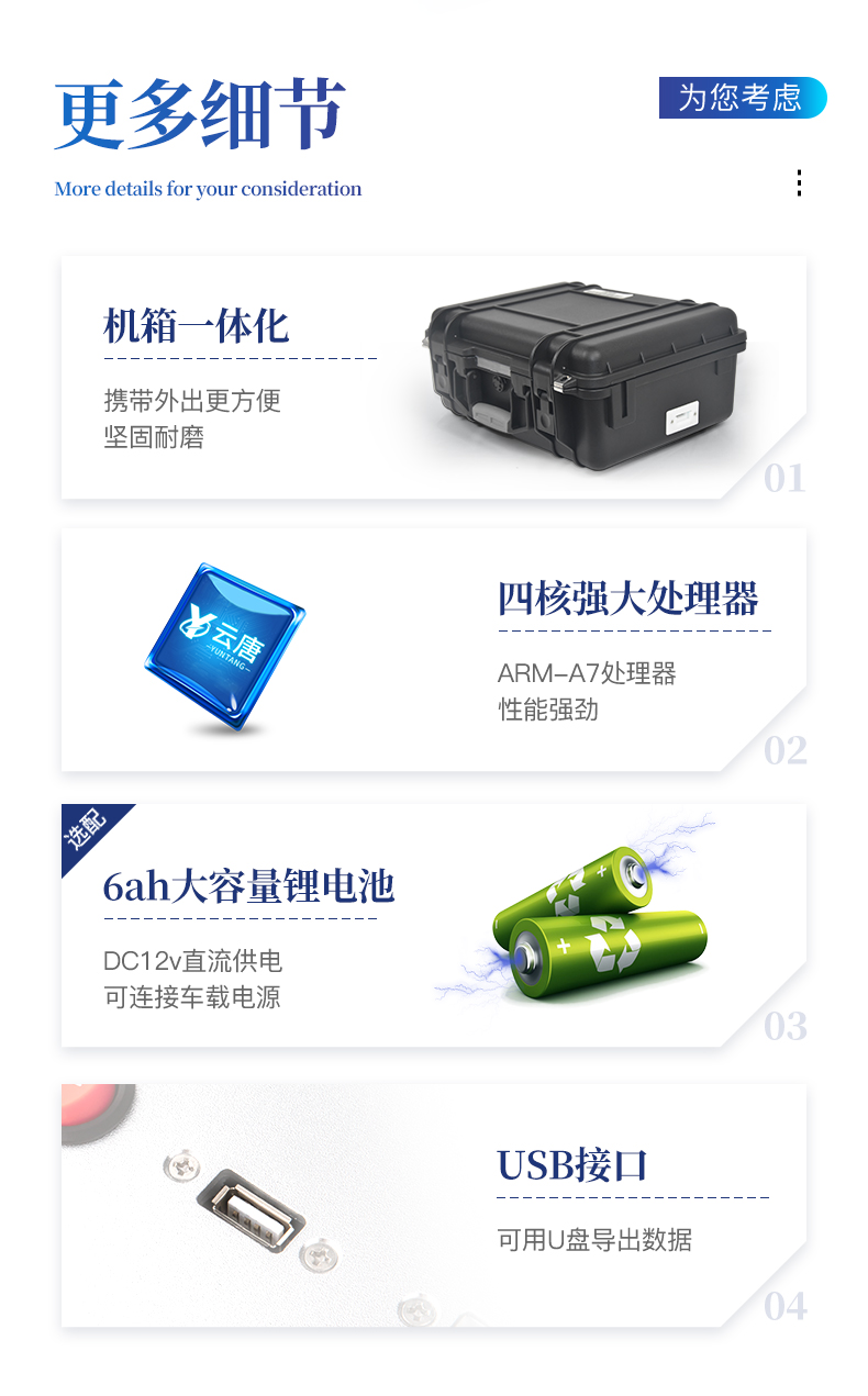 | 主控芯片采用ARM Cortex-A7,RK3288/4核處理器,主頻1.88Ghz,運(yùn)轉(zhuǎn)速度更快速,穩(wěn)定性更強(qiáng)。 | 顯示方式:7英寸液晶觸摸屏顯示,人性化中文操作界面,讀數(shù)直觀、簡單。 | 交直流兩用,直流12V供電,可連接車載電源,可配6ah大容量充電鋰電池,方便戶外流動(dòng)測試。 | 四波長冷光源,每個(gè)通道均配置410、520、590、630nm波長光源,標(biāo)配**的光路切換裝置,專利光路切換功能可實(shí)現(xiàn)*多64波長,并且所有檢測項(xiàng)目可實(shí)現(xiàn)所有通道同時(shí)檢測。 | 光源亮度自動(dòng)調(diào)節(jié)與校準(zhǔn) | 智能恒流穩(wěn)壓,光強(qiáng)自動(dòng)校準(zhǔn),長時(shí)間連續(xù)工作光源無溫漂現(xiàn)象。 | 內(nèi)置新國家限量標(biāo)準(zhǔn),與所測結(jié)果進(jìn)行現(xiàn)場比對,并持續(xù)更新標(biāo)準(zhǔn)。 | 不間斷進(jìn)樣,連續(xù)檢測 | 樣本編號自動(dòng)累加。 | 數(shù)據(jù)無線上傳平臺,并可從平臺導(dǎo)出為Excel表格。 | 檢測結(jié)果存儲(chǔ)容量20萬條 | 同時(shí)支持U盤拷貝,標(biāo)準(zhǔn)USB接口,免驅(qū)動(dòng)插拔。 | 檢測項(xiàng)目可擴(kuò)充,固件可升級 | 儀器尺寸:43×35×20cm, 主機(jī)凈重:5.2kg |