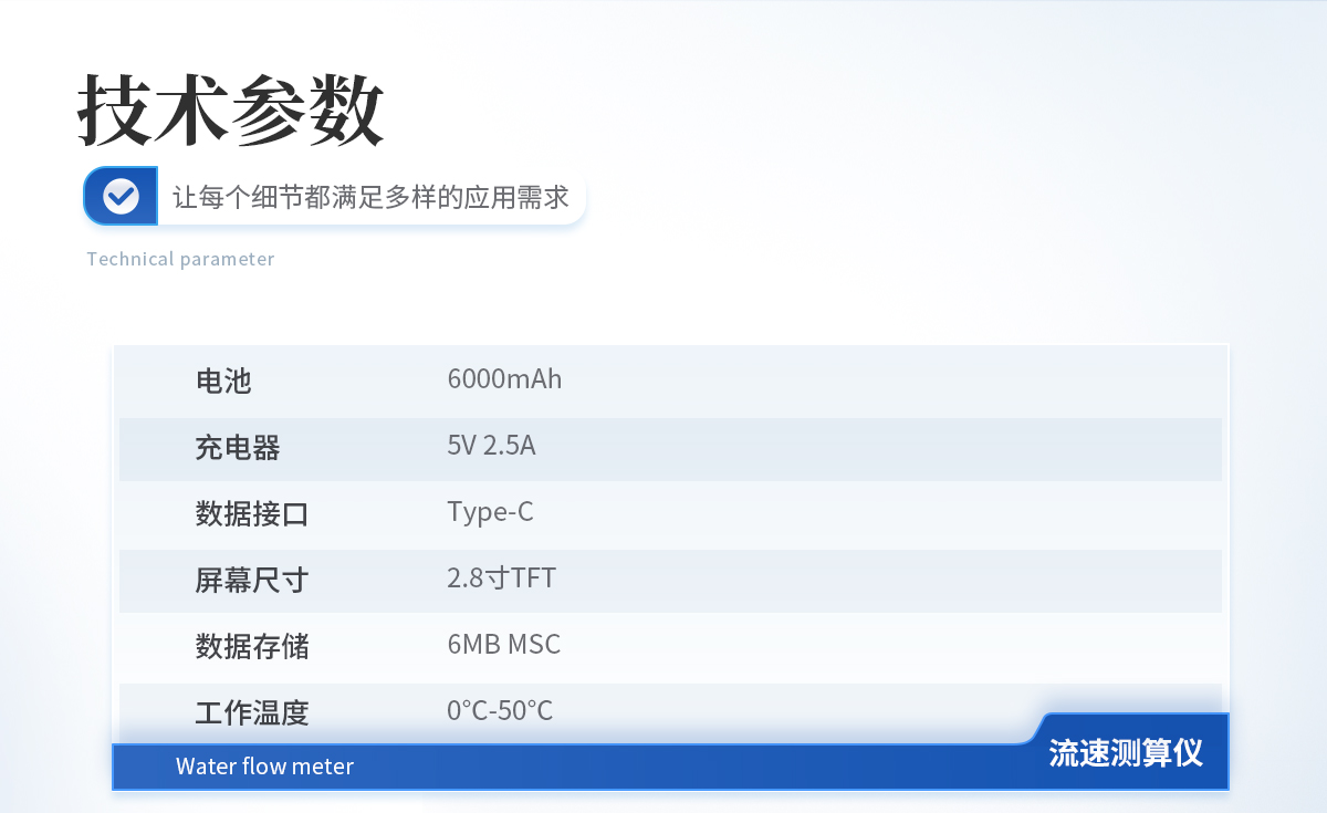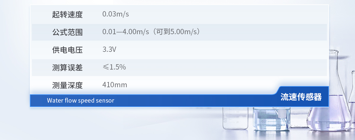 起轉(zhuǎn)速度 :0.03m/s 公式范圍 :0.01—4.00m/s(可到5.00m/s) 供電電壓:3.3V 測算誤差 :≤1.5% 測量深度 :410mm