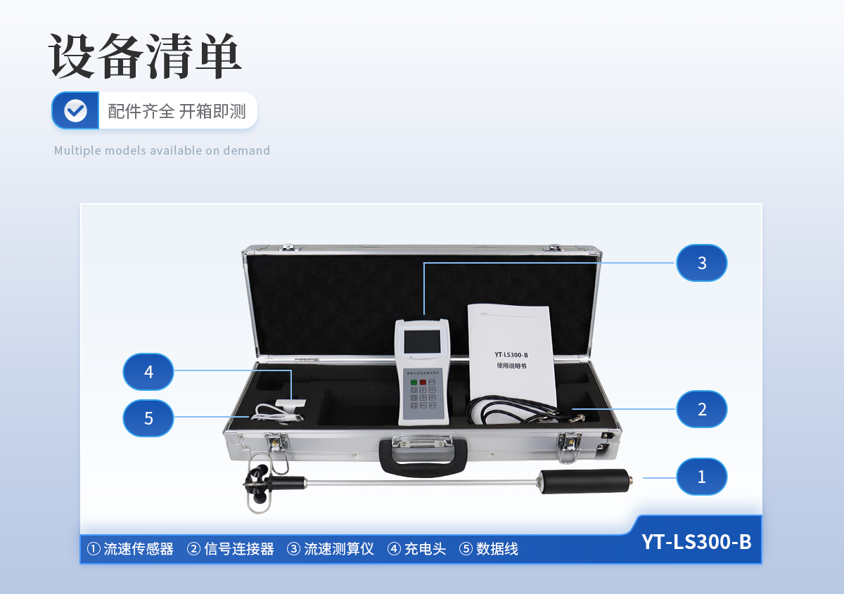 ①流速傳感器、②信號連接器、③流速測算儀、④充電頭、⑤數(shù)據(jù)線