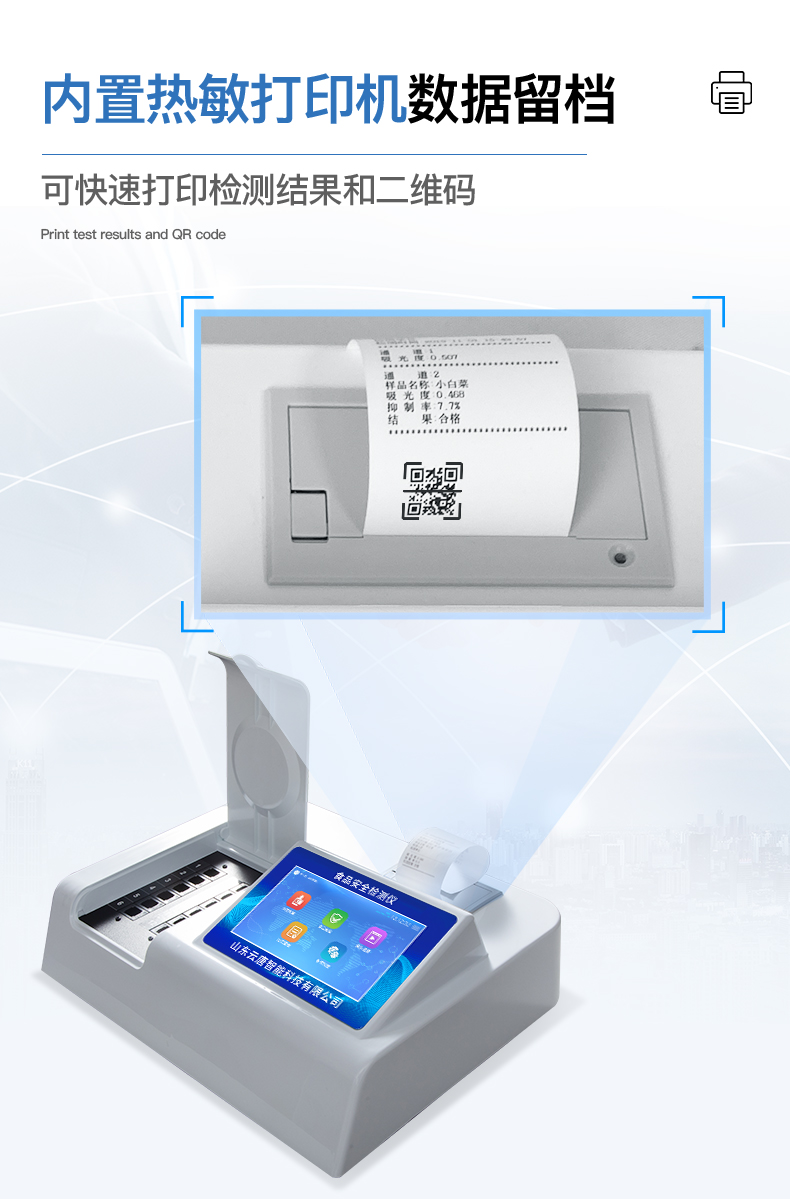 | 安卓智能操作系統(tǒng),采用更加**和人性化操作,儀器具有網(wǎng)線連接、wifi聯(lián)網(wǎng)上傳、GPRS無線遠傳功能,快速上傳數(shù)據(jù)。 | 智能化程度高,儀器具有自檢功能:具有開機自檢和調(diào)零功能,具有自動檢測重復(fù)性功能。 | 檢測通道:≥12個檢測通道,可以同時測試多個樣品,每個樣品由程序控制分別獨立工作,不會互相干擾。 | 顯示方式:≥8英寸液晶觸摸屏顯示,人性化中文操作界面,讀數(shù)直觀、簡單。 | 配備新一代嵌入式熱敏打印機,可選擇手動打印或者自動打印,檢測完成可自動打印檢測報告和二維碼。 | 光源采用進口超高亮發(fā)光二極管,高精度、穩(wěn)定性強、光源可控、可以關(guān)掉不使用的光源,功耗更低。 | 采用USB2.0接口設(shè)計,方便數(shù)據(jù)的存貯和移動,并可隨時與計算機直接相連,并且可用計算機控制儀器。實現(xiàn)數(shù)據(jù)查詢、瀏覽、分析、統(tǒng)計、打印等。 | 儀器帶有監(jiān)管平臺。數(shù)據(jù)可局域網(wǎng)和互聯(lián)網(wǎng)數(shù)據(jù)上傳,檢測結(jié)果直接傳至食品安全監(jiān)管平臺。進行區(qū)域食品安全監(jiān)管及大數(shù)據(jù)分析處理,檢測區(qū)域食品安全長短期動態(tài),達到食品安全問題預(yù)估、預(yù)警 | 一體化便攜式快檢設(shè)備,滿足現(xiàn)場及流動檢測使用需求,能夠在同一軟件下實現(xiàn)所有檢測項目的檢測,并可通過同一窗口直觀顯示檢測結(jié)果。 | 儀器具有多品類多種類樣品菜單庫,可靈活選擇檢測樣品,不同的檢測通道可同時檢測不同的樣品項目。也可在儀器上直接編輯錄入樣品名稱、檢測指標、送檢單位等信息并保存進樣品數(shù)據(jù)庫。 | 樣品處理簡單省力,整體操作快速、安全、便捷。 | 儀器具有自身保護功能,可設(shè)置用戶名及密碼,防止非工作人員操作等。 | 高靈敏度,高檢測精度,高重復(fù)性精度,掃描式高精度光學(xué)傳感器。 | 內(nèi)置強大的數(shù)據(jù)庫,可在儀器上直接選擇樣品名稱、檢測指標、送檢單位等信息,也可在儀器上直接編輯錄入樣品名稱、檢測指標、送檢單位等信息并保存進樣品數(shù)據(jù)庫。 | 儀器具有重新校準、鎖定、恢復(fù)出廠設(shè)置功能。 | 支持U盤存儲。 結(jié)果判定線可修改,對照值標定值可保存,斷電不丟失數(shù)據(jù)。 |
