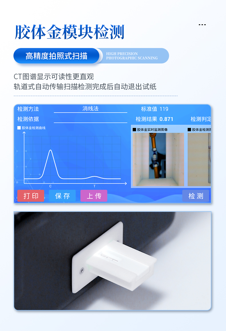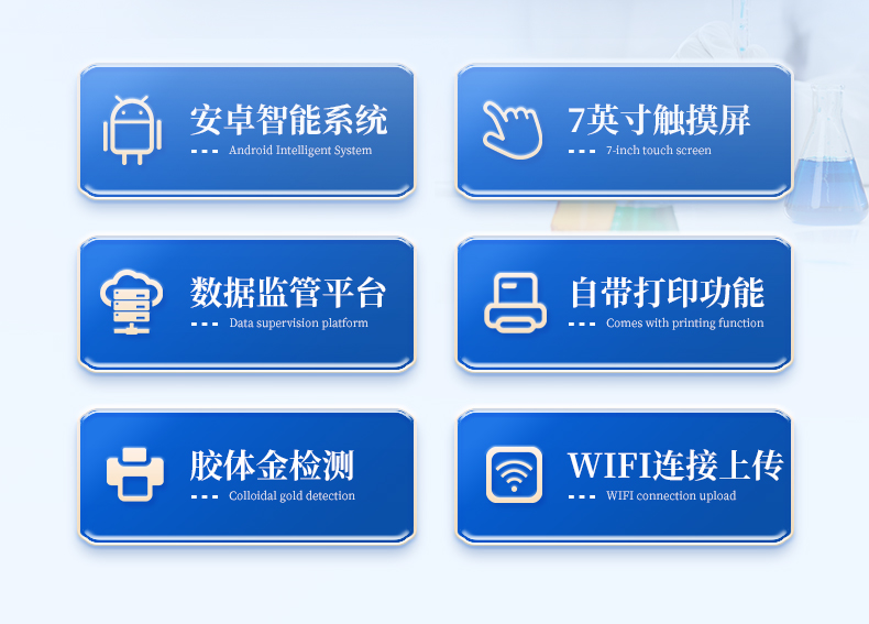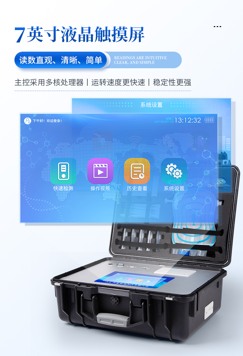 | 儀器采用手提式一體化系統(tǒng)檢測技術(shù),將分光光度模塊、新型農(nóng)殘檢測模塊、數(shù)字化管理模塊、無線通訊模塊高度集成于一體,支持檢測200種食品安全檢測項目,同時預(yù)留升級檢測方法。 | 儀器檢測模塊標準化、智能化,檢測項目可隨意自由組合。檢測箱體內(nèi)置多個標準檢測單元,檢測模塊可以調(diào)整配置。 | 顯示屏幕:儀器采用10.1英寸豎向液晶觸摸屏顯,搭配運行安卓智能操作系統(tǒng),主控芯片采用ARM Cortex-A7,RK3288/4核處理器,主頻1.88Ghz,操作方便,性能更強。 | 檢測通道:≥12通道;采用精密旋轉(zhuǎn)比色池設(shè)計,使用同芯片同光源校準精度,解決不同光源之間的誤差值,更加準確**。(1-12通道間誤差0.1%,***:**202022821055.2) | 儀器光源:高精度進口四波長冷光源,每個通道均配置 410、520、590、630nm 波長光源,標配**的光路切換裝置,專利光路切換功能可實現(xiàn)64波長,并且所有檢測項目可實現(xiàn)所有通道同時檢測。 | 設(shè)備可一鍵校準,自動保存校準數(shù)據(jù),自動對比校驗,得到精準光源,采用Android SP存儲數(shù)據(jù),光源數(shù)據(jù)永不丟失,方便每一次使用。 | 通訊接口:配備無線通信模塊、4G(APN)通訊模塊、藍牙傳輸,同時具有雙USB接口以及RJ45網(wǎng)線接口,可以多方式實現(xiàn)數(shù)據(jù)保存及數(shù)據(jù)傳輸 | 存儲方式:支持U盤存儲,標準USB接口,免驅(qū)動安裝。檢測結(jié)果存儲容量20萬條以上,可生成Excel表格進行拷貝,并具有登錄保護功能。 | 智能化操作系統(tǒng): | 1)操作系統(tǒng):儀器可在同一檢測界面自動對應(yīng)相關(guān)檢測通道,一次性選擇1-12個樣品名稱,無需退出界面,節(jié)省操作時間。并可以對每個通道屬性和樣品信息單獨進行編輯,例如送檢單位、人員,檢測人員等,打印時勾選打印顯示。 | 2)數(shù)據(jù)集成系統(tǒng):設(shè)備首頁自動匯總分析檢測數(shù)據(jù),包含:周檢測數(shù)據(jù)、月檢測數(shù)據(jù),全部檢測總數(shù)量,均包含檢測總數(shù),合格數(shù),不合格數(shù),以及相關(guān)柱形分析圖,各項檢測數(shù)據(jù)一目了然,無需電腦查詢,更加快捷直觀。 | 3)數(shù)據(jù)庫系統(tǒng):十幾項數(shù)據(jù)庫分類管理儀器:包含項目類型、項目數(shù)據(jù)、檢測數(shù)據(jù)、歷史記錄、國標信息、曲線信息、采樣信息、檢測信息、受檢信息、復(fù)核信息、圖表信息、光源校準信息、打印樣式信息、樣品庫信息等等,數(shù)據(jù)庫之間互相協(xié)調(diào)聯(lián)動保證數(shù)據(jù)的真實完整性。同時產(chǎn)品數(shù)據(jù)庫以及歷史檢測記錄支持一鍵檢索功能。 | 4)限量規(guī)判系統(tǒng):具有限量查詢、添加物質(zhì)合規(guī)判定系統(tǒng)。檢測出結(jié)果后,系統(tǒng)自動調(diào)用系統(tǒng)數(shù)據(jù)庫中相關(guān)國標進行比對判定,客觀顯示判定結(jié)果是否合格。 | 5)項目預(yù)設(shè)系統(tǒng):儀器具有任務(wù)預(yù)設(shè)模塊,一鍵提前預(yù)設(shè),給出方便快捷的新檢測方案,每一個任務(wù)分別可以設(shè)置不同的樣品、批次、編號、來源、備注、抽樣信息、檢測信息、受檢信息、復(fù)核信息等更多信息。樣品送檢時一鍵調(diào)取保存信息,并可多次調(diào)取,大大提高檢測效率。 | 6)數(shù)據(jù)監(jiān)管系統(tǒng):同步對接監(jiān)管平臺,數(shù)據(jù)可局域網(wǎng)和互聯(lián)網(wǎng)數(shù)據(jù)上傳,檢測結(jié)果可選擇直接傳至食品安全監(jiān)管平臺。進行區(qū)域食品安全監(jiān)管及大數(shù)據(jù)分析處理與數(shù)據(jù)統(tǒng)計,檢測區(qū)域食品安全長短期動態(tài),達到食品安全問題預(yù)估、預(yù)警。 | 7)打印系統(tǒng):內(nèi)置全新打印機,新創(chuàng)自定義打印方式,可按需靈活勾選控制:產(chǎn)品合格證(國家農(nóng)業(yè)部標準要求),二維碼,抽樣信息、檢測信息,受檢信息、復(fù)核信息、抽樣日期、檢測日期等信息的打印。 | 供電模式:儀器交直流兩用,直流12V供電,可連接車載電源,可配6ah大容量充電鋰電池,電量可實時顯示,方便戶外流動測試。 | 膠體金檢測模塊:采用雙通道CMOS成像處理技術(shù)及膠體金免疫層析技術(shù),可同時讀取雙膠體金卡數(shù)據(jù),自動采集、處理分析,將檢測結(jié)果顯示,并可根據(jù)參考限值自動判斷檢測結(jié)果,可檢測常見的獸藥殘留、生物毒素、抗生素、違禁添加物等。 | 1)探測技術(shù):CMOS成像探測; | 2)檢測通道:1個通道; | 3)檢測方式:消線法和比色法; | 4)顯示模式:陰性或陽性; | 5)曲線形式:軌道式掃描方式,顯示金標卡圖像,實時生成、識別CT曲線圖,無需手動調(diào)整,完成檢測后自動退出檢測卡。兼容市場上其他金標卡,使用耗材不受限制。 | 儀器加入遠程升級功能,可定向分客戶分儀器更新,開機后自動更新,客戶無需任何操作,即可升級全新項目。做到了無需退換機器即可實現(xiàn)實時遠程升級檢測儀器。 |
