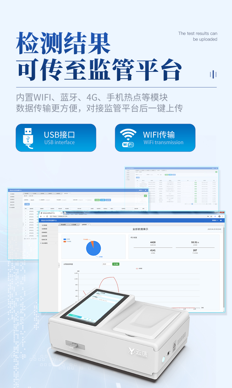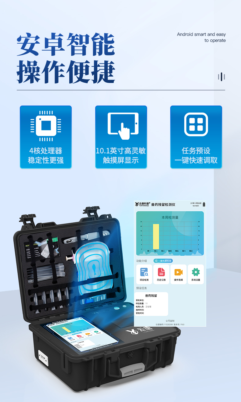 | 1、儀器采用臺(tái)式一體化系統(tǒng)檢測(cè)技術(shù),將分光光度模塊、數(shù)字化管理模塊、無(wú)線通訊模塊高度集成于一體,支持檢測(cè)幾十種食品安全檢測(cè)項(xiàng)目,同時(shí)預(yù)留升級(jí)檢測(cè)方法。 | 2、儀器檢測(cè)模塊標(biāo)準(zhǔn)化、智能化,檢測(cè)項(xiàng)目可隨意自由組合。檢測(cè)箱體內(nèi)置多個(gè)標(biāo)準(zhǔn)檢測(cè)單元,檢測(cè)模塊可以調(diào)整配置。 | 3、顯示屏幕:儀器采用7英寸液晶觸摸屏,搭配運(yùn)行安卓智能操作系統(tǒng),主控芯片采用ARM Cortex-A7,RK3288/4核處理器,主頻1.88Ghz,操作方便,性能更強(qiáng)。 | 4、檢測(cè)通道:≥12通道;采用精密旋轉(zhuǎn)比色池設(shè)計(jì),使用同芯片同光源校準(zhǔn)精度,解決不同光源之間的誤差值,更加準(zhǔn)確**。 | 5、儀器光源:高精度進(jìn)口四波長(zhǎng)冷光源,每個(gè)通道均配置 410、520、590、630nm 波長(zhǎng)光源,標(biāo)配**的光路切換裝置,專(zhuān)利光路切換功能可實(shí)現(xiàn)64波長(zhǎng),并且所有檢測(cè)項(xiàng)目可實(shí)現(xiàn)所有通道同時(shí)檢測(cè)。 | 6、通訊接口:配備無(wú)線通信模塊、可選配4G(APN)通訊模塊和藍(lán)牙傳輸,同時(shí)具有USB接口,可以多方式實(shí)現(xiàn)數(shù)據(jù)保存及數(shù)據(jù)傳輸。 | 7、存儲(chǔ)方式:支持U盤(pán)存儲(chǔ),標(biāo)準(zhǔn)USB接口,免驅(qū)動(dòng)安裝。檢測(cè)結(jié)果存儲(chǔ)容量20萬(wàn)條以上,可生成Excel表格進(jìn)行拷貝,并具有登錄保護(hù)功能。 | 8、智能化操作系統(tǒng) | 8.1、操作系統(tǒng):儀器可在同一檢測(cè)界面自動(dòng)對(duì)應(yīng)相關(guān)檢測(cè)通道,一次性選擇1-12個(gè)樣品名稱(chēng),無(wú)需退出界面,節(jié)省操作時(shí)間。并可以對(duì)每個(gè)通道屬性和樣品信息單獨(dú)進(jìn)行編輯,例如送檢單位、人員,檢測(cè)人員等,打印時(shí)勾選打印顯示。 | 8.2、限量規(guī)判系統(tǒng):具有限量查詢(xún)、添加物質(zhì)合規(guī)判定系統(tǒng)。檢測(cè)出結(jié)果后,系統(tǒng)自動(dòng)調(diào)用系統(tǒng)數(shù)據(jù)庫(kù)中相關(guān)國(guó)標(biāo)進(jìn)行比對(duì)判定,客觀顯示結(jié)果是否合格。 | 8.3、數(shù)據(jù)監(jiān)管系統(tǒng):同步對(duì)接監(jiān)管平臺(tái),數(shù)據(jù)可局域網(wǎng)和互聯(lián)網(wǎng)數(shù)據(jù)上傳,檢測(cè)結(jié)果可選擇直接傳至食品安全監(jiān)管平臺(tái)。進(jìn)行區(qū)域食品安全監(jiān)管及大數(shù)據(jù)分析處理與數(shù)據(jù)統(tǒng)計(jì),檢測(cè)區(qū)域食品安全長(zhǎng)短期動(dòng)態(tài),達(dá)到食品安全問(wèn)題預(yù)估、預(yù)警。 | 8.4、打印系統(tǒng):內(nèi)置全新打印機(jī),可以打印:項(xiàng)目名稱(chēng),二維碼,抽樣信息、檢測(cè)信息,受檢信息、復(fù)核信息、抽樣日期、檢測(cè)日期等信息的打印。 | 9、供電模式:儀器交直流兩用,直流12V供電(標(biāo)配),可連接車(chē)載電源,亦可選配6ah大容量充電鋰電池,電量可實(shí)時(shí)顯示,方便戶(hù)外流動(dòng)測(cè)試。 | 10、儀器具有重新校準(zhǔn)、鎖定、恢復(fù)出廠設(shè)置功能, | 11、外觀尺寸:415X310X150(mm) ,并可加配鋁合金手提箱 |