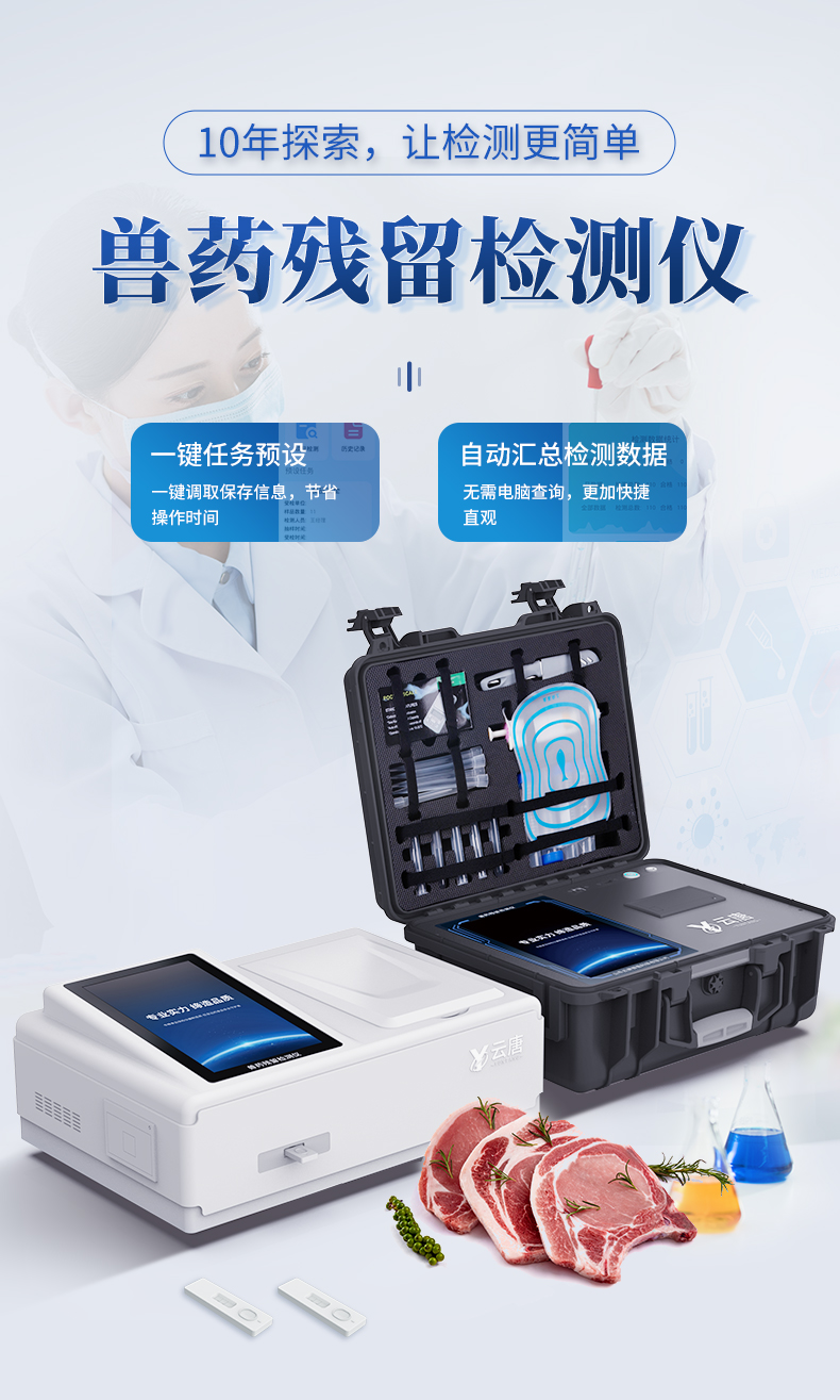 山東云唐智能科技有限公司生產(chǎn)的病害肉檢測(cè)儀為集成化食品安全快速檢測(cè)分析設(shè)備,采用臺(tái)式一體化設(shè)計(jì),可對(duì)豬肉、牛肉、羊肉、魚類等存在的病害肉組胺、揮發(fā)性鹽基氮進(jìn)行快速定量檢測(cè),儀器預(yù)留其他項(xiàng)目檢測(cè)程序和端口,根據(jù)日后需求可進(jìn)行遠(yuǎn)程升級(jí)