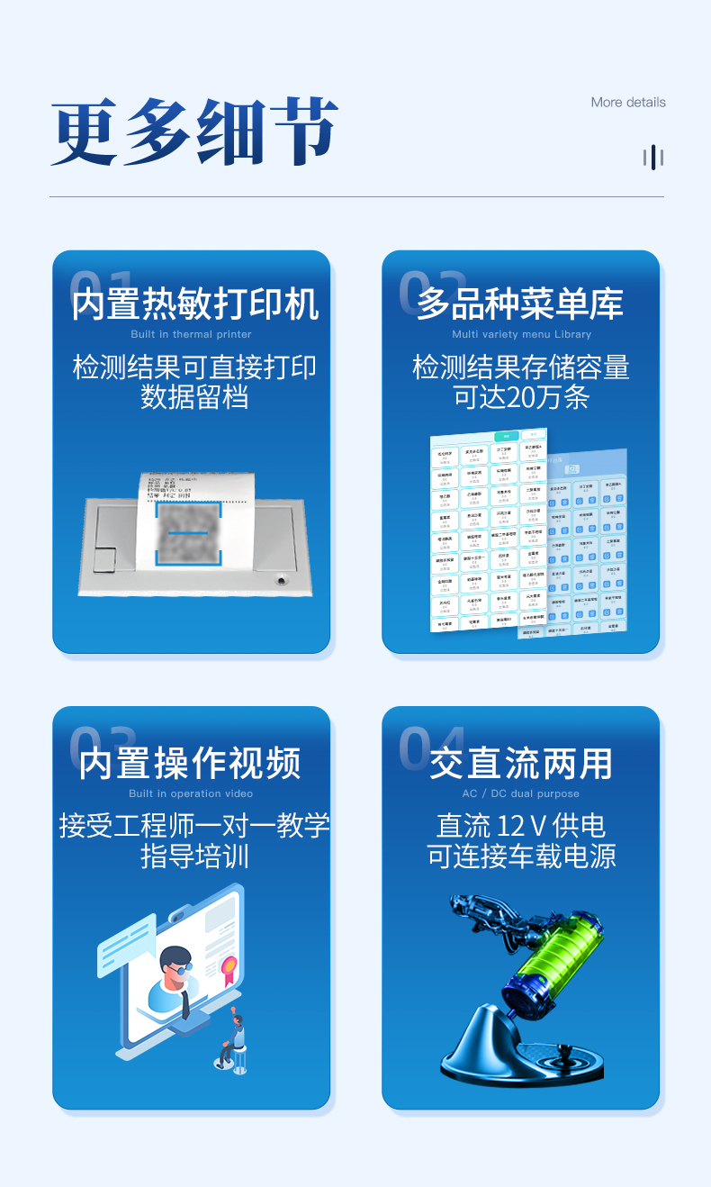 | 儀器采用臺(tái)式一體化系統(tǒng)檢測(cè)技術(shù),將分光光度模塊、數(shù)字化管理模塊、無線通訊模塊高度集成于一體,可支持檢測(cè)60種食品安全檢測(cè)項(xiàng)目,同時(shí)預(yù)留升級(jí)檢測(cè)方法。 | 儀器檢測(cè)模塊標(biāo)準(zhǔn)化、智能化,檢測(cè)項(xiàng)目可隨意自由組合。檢測(cè)箱體內(nèi)置多個(gè)標(biāo)準(zhǔn)檢測(cè)單元,檢測(cè)模塊可以調(diào)整配置。 | 顯示屏幕:儀器采用10.1英寸豎向液晶觸摸屏顯,搭配運(yùn)行安卓智能操作系統(tǒng),主控芯片采用ARM Cortex-A7,RK3288/4核處理器,主頻1.88Ghz,操作方便,性能更強(qiáng)。 | 檢測(cè)通道:≥12通道;采用精密旋轉(zhuǎn)比色池設(shè)計(jì),使用同芯片同光源校準(zhǔn)精度,解決不同光源之間的誤差值,更加準(zhǔn)確**。(1-12通道間誤差0.1%,***:**202022821055.2) | 儀器光源:高精度進(jìn)口四波長(zhǎng)冷光源,每個(gè)通道均配置 410、520、590、630nm 波長(zhǎng)光源,標(biāo)配**的光路切換裝置,專利光路切換功能可實(shí)現(xiàn)64波長(zhǎng),并且所有檢測(cè)項(xiàng)目可實(shí)現(xiàn)所有通道同時(shí)檢測(cè)。 | 設(shè)備可一鍵校準(zhǔn),自動(dòng)保存校準(zhǔn)數(shù)據(jù),自動(dòng)對(duì)比校驗(yàn),得到精準(zhǔn)光源,采用Android SP存儲(chǔ)數(shù)據(jù),光源數(shù)據(jù)永不丟失,方便每一次使用。 | 通訊接口:配備無線通信模塊、4G(APN)通訊模塊、藍(lán)牙傳輸,同時(shí)具有雙USB接口以及RJ45網(wǎng)線接口,可以多方式實(shí)現(xiàn)數(shù)據(jù)保存及數(shù)據(jù)傳輸。 | 存儲(chǔ)方式:支持U盤存儲(chǔ),標(biāo)準(zhǔn)USB接口,免驅(qū)動(dòng)安裝。檢測(cè)結(jié)果存儲(chǔ)容量20萬條以上,可生成Excel表格進(jìn)行拷貝,并具有登錄保護(hù)功能。 | 智能化操作系統(tǒng): | 1、操作系統(tǒng):儀器可在同一檢測(cè)界面自動(dòng)對(duì)應(yīng)相關(guān)檢測(cè)通道,一次性選擇1-12個(gè)樣品名稱,無需退出界面,節(jié)省操作時(shí)間。并可以對(duì)每個(gè)通道屬性和樣品信息單獨(dú)進(jìn)行編輯,例如送檢單位、人員,檢測(cè)人員等,打印時(shí)勾選打印顯示。 | 2、數(shù)據(jù)集成系統(tǒng):設(shè)備首頁(yè)自動(dòng)匯總分析檢測(cè)數(shù)據(jù),包含:周檢測(cè)數(shù)據(jù)、月檢測(cè)數(shù)據(jù),全部檢測(cè)總數(shù)量,均包含檢測(cè)總數(shù),合格數(shù),不合格數(shù),以及相關(guān)柱形分析圖,各項(xiàng)檢測(cè)數(shù)據(jù)一目了然,無需電腦查詢,更加快捷直觀。 | 3、數(shù)據(jù)庫(kù)系統(tǒng):十幾項(xiàng)數(shù)據(jù)庫(kù)分類管理儀器:包含項(xiàng)目類型、項(xiàng)目數(shù)據(jù)、檢測(cè)數(shù)據(jù)、歷史記錄、國(guó)標(biāo)信息、曲線信息、采樣信息、檢測(cè)信息、受檢信息、復(fù)核信息、圖表信息、光源校準(zhǔn)信息、打印樣式信息、樣品庫(kù)信息等等,數(shù)據(jù)庫(kù)之間互相協(xié)調(diào)聯(lián)動(dòng)保證數(shù)據(jù)的真實(shí)完整性。同時(shí)產(chǎn)品數(shù)據(jù)庫(kù)以及歷史檢測(cè)記錄支持一鍵檢索功能。 | 4、限量規(guī)判系統(tǒng):具有限量查詢、添加物質(zhì)合規(guī)判定系統(tǒng)。檢測(cè)出結(jié)果后,系統(tǒng)自動(dòng)調(diào)用系統(tǒng)數(shù)據(jù)庫(kù)中相關(guān)國(guó)標(biāo)進(jìn)行比對(duì)判定,客觀顯示判定結(jié)果是否合格。 | 5、項(xiàng)目預(yù)設(shè)系統(tǒng):儀器具有任務(wù)預(yù)設(shè)模塊,一鍵提前預(yù)設(shè),給出方便快捷的新檢測(cè)方案,每一個(gè)任務(wù)分別可以設(shè)置不同的樣品、批次、編號(hào)、來源、備注、抽樣信息、檢測(cè)信息、受檢信息、復(fù)核信息等更多信息。樣品送檢時(shí)一鍵調(diào)取保存信息,并可多次調(diào)取,大大提高檢測(cè)效率。 | 6、數(shù)據(jù)監(jiān)管系統(tǒng):同步對(duì)接監(jiān)管平臺(tái),數(shù)據(jù)可局域網(wǎng)和互聯(lián)網(wǎng)數(shù)據(jù)上傳,檢測(cè)結(jié)果可選擇直接傳至食品安全監(jiān)管平臺(tái)。進(jìn)行區(qū)域食品安全監(jiān)管及大數(shù)據(jù)分析處理與數(shù)據(jù)統(tǒng)計(jì),檢測(cè)區(qū)域食品安全長(zhǎng)短期動(dòng)態(tài),達(dá)到食品安全問題預(yù)估、預(yù)警。 | 7.1、全新打印系統(tǒng):內(nèi)置全新打印機(jī),新創(chuàng)自定義打印方式,可按需靈活勾選控制:二維碼,抽樣信息、檢測(cè)信息,受檢信息、復(fù)核信息、抽樣日期、檢測(cè)日期等信息的打印。 | 7.2、A4紙版本報(bào)告打印功能(可選配):設(shè)備擁有兩種結(jié)果展示方式,可以自動(dòng)生成A4打印模板和小票打印模板兩種樣式,可通過WiFi及網(wǎng)線等方式鏈接外置打印機(jī)可進(jìn)行打印。 | 供電模式:儀器交直流兩用,直流12V供電,可連接車載電源,可配6ah大容量充電鋰電池,電量可實(shí)時(shí)顯示,方便戶外流動(dòng)測(cè)試。 | 儀器具備遠(yuǎn)程升級(jí)功能,可定向分客戶分儀器更新,開機(jī)后自動(dòng)更新,并可持續(xù)性免費(fèi)更新系統(tǒng)版本,無需像傳統(tǒng)產(chǎn)品返廠更新,節(jié)省時(shí)間及人力成本并避免了物流運(yùn)輸返廠升級(jí)導(dǎo)致設(shè)備損壞的潛在風(fēng)險(xiǎn)。 |