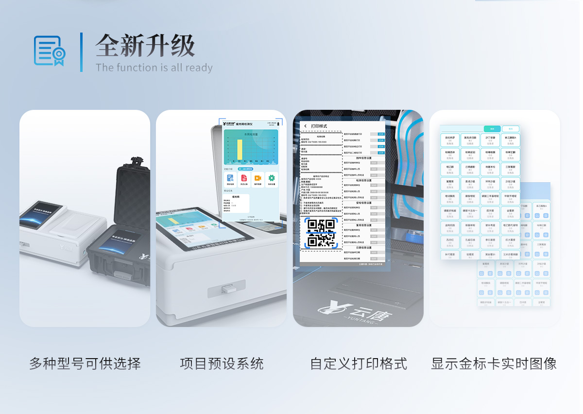 | 儀器采用10.1英寸液晶觸摸屏顯,搭配運(yùn)行安卓智能操作系統(tǒng),主控芯片采用ARM Cortex-A7,RK3288/4核處理器,主頻1.88Ghz,運(yùn)轉(zhuǎn)速度更快速,性能更強(qiáng)。 | 儀器功能包括:膠體金檢測(cè)模塊、數(shù)字化管理模塊、無(wú)線通訊模塊等,可以滿足同一軟件下實(shí)現(xiàn)所有檢測(cè)項(xiàng)目的檢測(cè),并在同一窗口展示檢測(cè)結(jié)果。 | 一體化臺(tái)式快檢設(shè)備,采用交直流兩用供電方式,可連接車載電源,配備6ah大容量充電鋰電池,可以滿足現(xiàn)場(chǎng)及流動(dòng)檢測(cè)使用的需求。儀器尺寸:43×35×20cm, 主機(jī)凈重:5.1kg | 系統(tǒng)自帶數(shù)據(jù)集成模塊,設(shè)備首頁(yè)自動(dòng)統(tǒng)計(jì)檢測(cè)數(shù)據(jù)包含:周檢測(cè)數(shù)據(jù)、月檢測(cè)數(shù)據(jù),全部檢測(cè)總數(shù)量,均包含檢測(cè)總數(shù),合格數(shù),不合格數(shù),以及相關(guān)柱形分析圖,對(duì)各項(xiàng)檢測(cè)數(shù)據(jù)清晰掌握,無(wú)需電腦查詢,更加快捷直觀。 | 儀器具有任務(wù)預(yù)設(shè)模塊,可在樣品送檢前提前預(yù)設(shè)樣品名稱、檢測(cè)指標(biāo)、送檢單位等信息,樣品送檢時(shí)一鍵調(diào)取保存信息,檢測(cè)更加方便快捷。 | 直插式自動(dòng)掃描方式,可實(shí)時(shí)顯示金標(biāo)卡實(shí)時(shí)圖像,系統(tǒng)自動(dòng)分析并呈現(xiàn)出CT曲線圖,CT線自動(dòng)識(shí)別,無(wú)需手動(dòng)調(diào)整,完成檢測(cè)后自動(dòng)退出檢測(cè)卡。 | 膠體金模塊檢測(cè)方式:軌道式自動(dòng)傳輸掃描,檢測(cè)完成后自動(dòng)退出檢測(cè)卡。 | 儀器檢測(cè)系統(tǒng)擁有龐大數(shù)據(jù)庫(kù),并且構(gòu)建了完善的檢索、修訂功能。食品庫(kù)涵蓋多種樣品名稱,可按需添加或刪除、編輯樣品名稱;產(chǎn)品數(shù)據(jù)庫(kù)以及歷史檢測(cè)記錄支持一鍵檢索功能。 | 系統(tǒng)打印自定義化,打印格式多樣化,產(chǎn)品合格證(國(guó)家標(biāo)準(zhǔn)要求),二維碼,抽樣信息、檢測(cè)信息,受檢信息、復(fù)核信息、抽樣日期、檢測(cè)日期等信息結(jié)果,可按需求自行設(shè)置打印內(nèi)容。 | A4紙版本報(bào)告打印功能(可選配):設(shè)備擁有兩種結(jié)果展示方式,可以自動(dòng)生成A4打印模板和小票打印模板兩種樣式,可通過(guò)WiFi及網(wǎng)線等方式鏈接外置打印機(jī)可進(jìn)行打印 | 儀器具有 wifi 聯(lián)網(wǎng)上傳、RJ45網(wǎng)線連接功能,可以快速上傳數(shù)據(jù)。同步對(duì)接監(jiān)管平臺(tái),數(shù)據(jù)可局域網(wǎng)和互聯(lián)網(wǎng)數(shù)據(jù)上傳,檢測(cè)結(jié)果直接傳至食品安全監(jiān)管平臺(tái)。進(jìn)行區(qū)域食品安全監(jiān)管及大數(shù)據(jù)分析處理與數(shù)據(jù)統(tǒng)計(jì),檢測(cè)區(qū)域食品安全長(zhǎng)短期動(dòng)態(tài),達(dá)到食品安全問(wèn)題預(yù)估、預(yù)警。 | 設(shè)備支持U盤(pán)存儲(chǔ),標(biāo)準(zhǔn)USB接口,免驅(qū)動(dòng)安裝。檢測(cè)結(jié)果存儲(chǔ)容量20萬(wàn)條以上,可生成Excel表格,進(jìn)行一鍵拷貝,并具有登錄保護(hù)功能,可設(shè)置用戶名及密碼,規(guī)范不同人員操作權(quán)限,防止非工作人員操作,并且可以進(jìn)行重新校準(zhǔn)、鎖定、恢復(fù)出廠設(shè)置功能。儀器固件可升級(jí),后期檢測(cè)項(xiàng)目可擴(kuò)充。 | 儀器具備遠(yuǎn)程升級(jí)功能,可定向分客戶分儀器更新,開(kāi)機(jī)后自動(dòng)更新,并可持續(xù)性免費(fèi)更新系統(tǒng)版本,無(wú)需像傳統(tǒng)產(chǎn)品返廠更新,節(jié)省時(shí)間及人力成本并避免了物流運(yùn)輸返廠升級(jí)導(dǎo)致設(shè)備損壞的潛在風(fēng)險(xiǎn)。 |