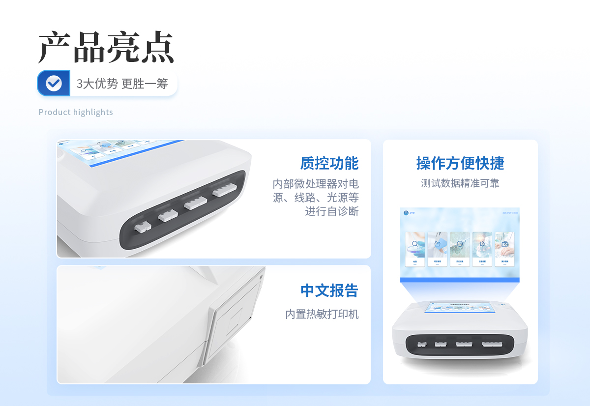 | 1、 Android觸控系統(tǒng)結(jié)合大尺寸高清屏幕,界面友好,操作簡單流暢,無需外接設(shè)備; | 2、 6通道可以同時(shí)檢測(cè)不同項(xiàng)目,顯著提升檢測(cè)效率,滿足批量樣本快速處理需求; | 3、 二維碼掃描錄入樣本信息,避免人工錯(cuò)誤 | 4、 8G超大容量內(nèi)存,支持按日期靈活查詢、預(yù)覽、刪除結(jié)果,并生成多樣化專業(yè)報(bào)告。 | 5、 內(nèi)置熱敏打印機(jī),檢測(cè)完成即可現(xiàn)場(chǎng)打印標(biāo)準(zhǔn)報(bào)告,提升工作效率。 | 6、 關(guān)鍵部件實(shí)時(shí)自診斷功能,保障儀器長期穩(wěn)定運(yùn)行。 | 7、 高速有線/無線網(wǎng)絡(luò)及藍(lán)牙,構(gòu)建完善的數(shù)據(jù)監(jiān)控平臺(tái),實(shí)現(xiàn)數(shù)據(jù)實(shí)時(shí)上傳、遠(yuǎn)程查詢、統(tǒng)計(jì)分析和監(jiān)管協(xié)同。 | 8、 豐富的接口設(shè)計(jì),輕松連接電腦、U盤、網(wǎng)絡(luò)及上位機(jī)系統(tǒng),支持U盤導(dǎo)出。 | 9、 孵育模塊為特定試紙條反應(yīng)提供**溫度環(huán)境。 | 10、 流線型結(jié)構(gòu),緊湊輕便,兼顧實(shí)驗(yàn)室耐用性與檢測(cè)需求。 | 11、 插卡判斷:檢測(cè)卡未插入檢測(cè)通道不能檢測(cè) | 12、 內(nèi)置質(zhì)控功能,可設(shè)備送檢、設(shè)備自檢、試劑卡自檢 | 13、 檢測(cè)方式:孵育檢測(cè)、即時(shí)檢測(cè)(對(duì)檢測(cè)數(shù)據(jù)復(fù)檢核實(shí)) | 14、 檢測(cè)曲線:可以對(duì)試劑卡的檢測(cè)核驗(yàn),防止誤判 | 15、 檢測(cè)結(jié)果:報(bào)告出檢測(cè)項(xiàng)目、被測(cè)物質(zhì)的濃度、檢測(cè)單位、被檢查單位、檢驗(yàn)員、檢測(cè)時(shí)間、檢測(cè)限等信息可在觸摸屏上顯示,可通過儀器內(nèi)置打印機(jī)輸出 | 16、 項(xiàng)目管理:支持檢測(cè)項(xiàng)目拓展功能 | 17、 界面設(shè)置:可修改標(biāo)題和頁尾信息,靈活展示儀器信息 |