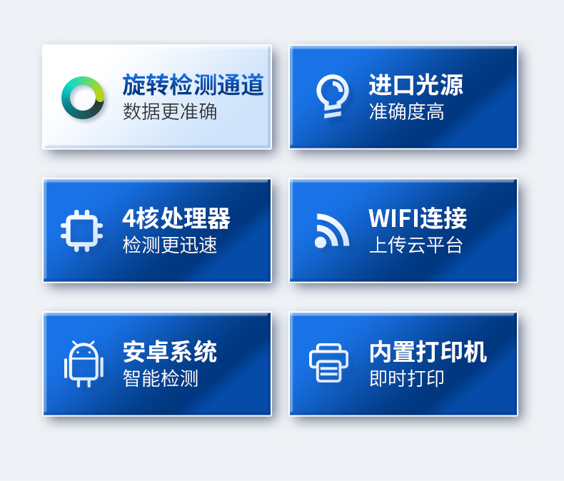 3、顯示屏幕:儀器采用7英寸液晶觸摸屏,搭配運(yùn)行安卓智能操作系統(tǒng),主控芯片采用ARM Cortex-A7,RK3288/4核處理器,主頻1.88Ghz,操作方便,性能更強(qiáng)。