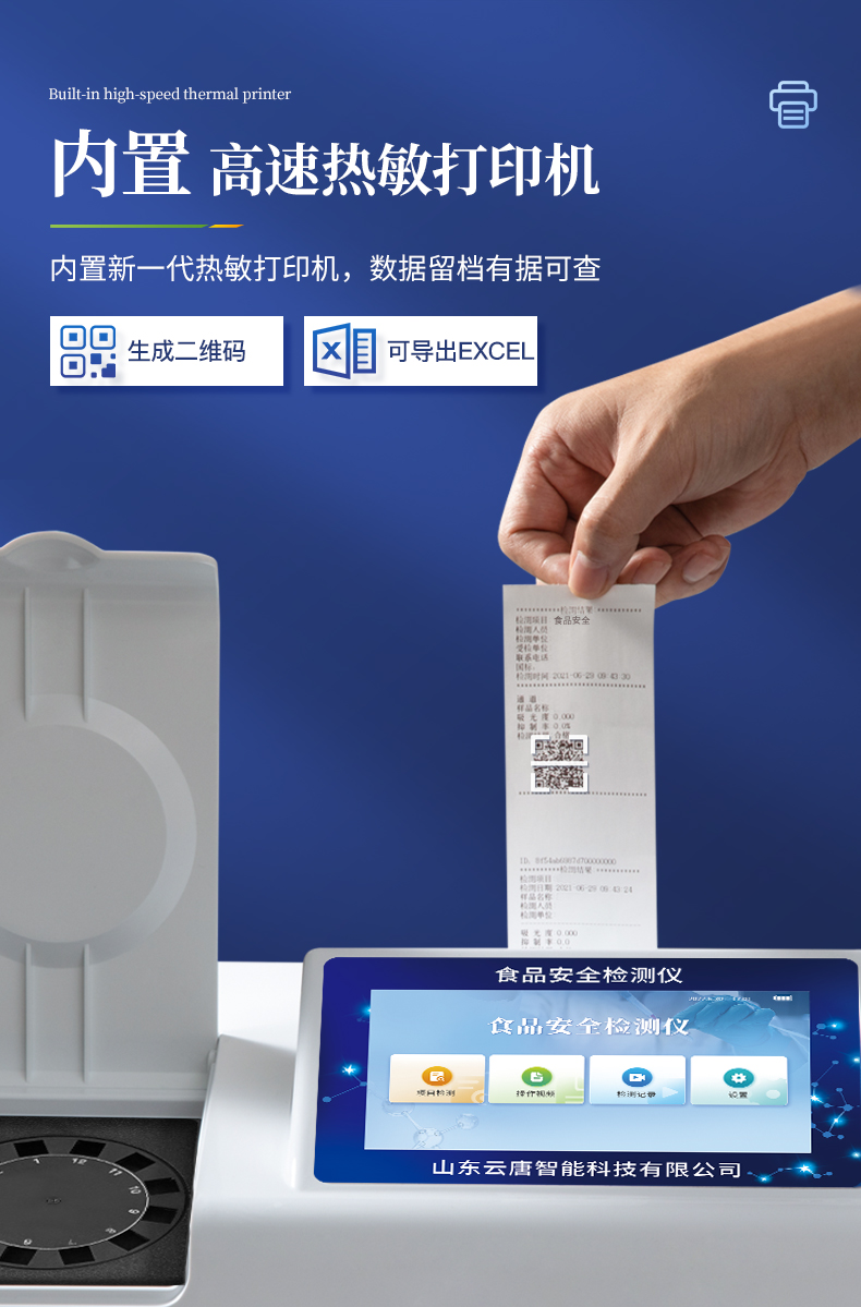 8.3、數(shù)據(jù)監(jiān)管系統(tǒng):同步對(duì)接監(jiān)管平臺(tái),數(shù)據(jù)可局域網(wǎng)和互聯(lián)網(wǎng)數(shù)據(jù)上傳,檢測(cè)結(jié)果可選擇直接傳至食品安全監(jiān)管平臺(tái)。進(jìn)行區(qū)域食品安全監(jiān)管及大數(shù)據(jù)分析處理與數(shù)據(jù)統(tǒng)計(jì),檢測(cè)區(qū)域食品安全長(zhǎng)短期動(dòng)態(tài),達(dá)到食品安全問(wèn)題預(yù)估、預(yù)警。8.4、打印系統(tǒng):內(nèi)置全新打印機(jī),可以打?。喉?xiàng)目名稱,二維碼,抽樣信息、檢測(cè)信息,受檢信息、復(fù)核信息、抽樣日期、檢測(cè)日期等信息的打印。