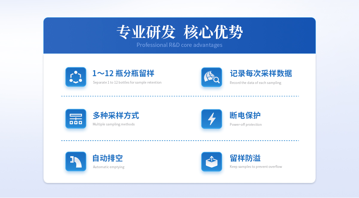 | 1、分瓶留樣功能:儀器可實現 1~12 瓶分瓶留樣,瓶數可自由設定; | 2、采樣功能:可實現定時采樣、時間等比、流量等比、外控采樣、串口控制等多種采樣方式; | 3、記錄功能:可記錄每次采樣的留樣瓶號、留樣時間、留樣量、COD 值和 NH3-N 值,可記錄*新 1000 條數據記錄; | 4、對外接口:流量計模擬接口,RS485 接口; | 5、斷電保護功能:儀器在運行狀態(tài)下斷電并重新通電后,儀器能自動恢復原 運行狀態(tài),斷電后儀器參數不丟失; | 6、自動排空功能:每次采樣完畢,系統(tǒng)可自動排空管內存水,以保證采樣管 路不產生沉積堵塞; | 7、防溢功能:用戶可設置留樣瓶數量,完成設定瓶數的留樣后停止留樣; | 8、水樣冷藏功能:采用**制冷裝置,可使留存的水樣保存在 0℃~4℃環(huán)境; |