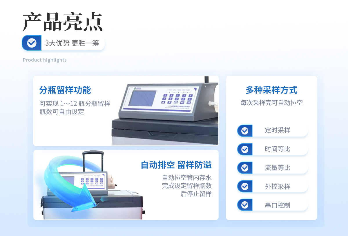 | 1.定時采樣:按照采樣定時表設定,水質自動采樣器將定量水樣從采樣點采 集到留樣瓶中。 | 2.時間等比例采樣:按照設定采樣時間間隔,水質自動采樣器將定量水樣從 采樣點采集到到留樣瓶中。 | 3.流量等比例采樣:每流過一定體積的水體,水質自動采樣器自動將定量水樣從采樣點采集到留樣瓶中。 | 4.超標留樣(外控采樣):當接收到外部觸發(fā)信號一開關量信號時或模擬量信號,水質自動采樣器將定量水樣從采樣點采集到留樣瓶中。 | 5.串口控制:當接收到串口命令時,按命令要求進行采樣。 |