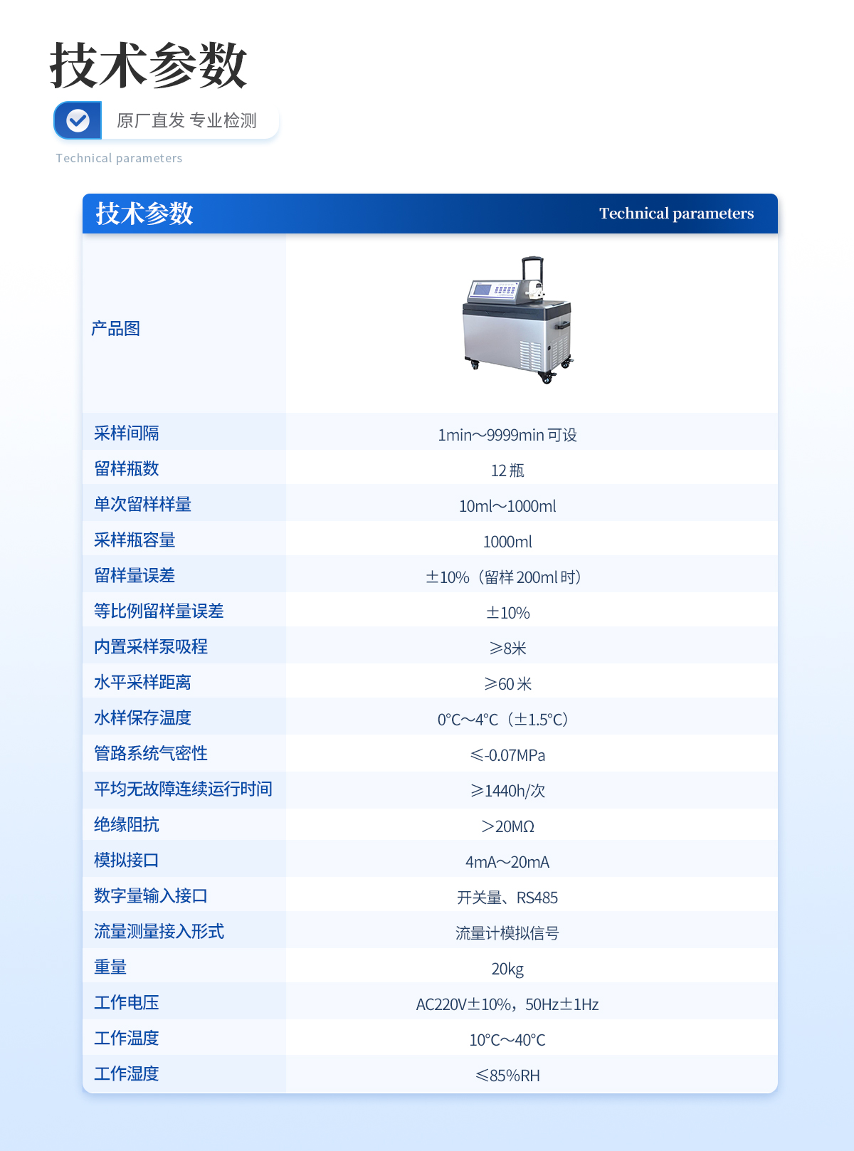 | 采樣間隔:1min~9999min 可設 | 留樣瓶數:12 瓶 | 單次留樣樣量:10ml~1000ml | 采樣瓶容量:1000ml | 留樣量誤差:±10%(留樣 200ml 時) | 等比例留樣量誤差:±10% | 內置采樣泵吸程:≥8米 | 水平采樣距離:≥60 米 | 水樣保存溫度:0℃~4℃(±1.5℃) | 管路系統(tǒng)氣密性:≤-0.07MPa | 平均無故障連續(xù)運行時間:≥1440h/次 | 絕緣阻抗:>20MΩ | 模擬接口:4mA~20mA | 數字量輸入接口:開關量、RS485 | 流量測量接入形式:流量計模擬信號 | 重量:20kg | 工作電壓:AC220V±10%,50Hz±1Hz | 工作溫度:10℃~40℃ | 工作濕度:≤85%RH |