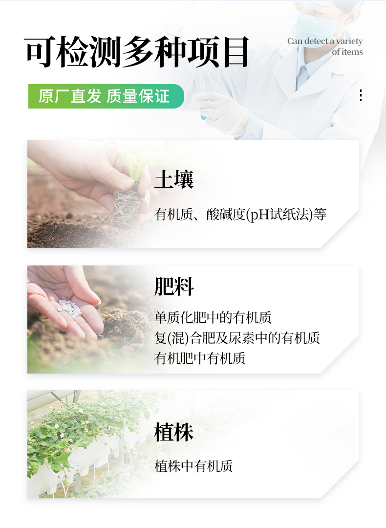 ★全項(xiàng)目土壤肥料養(yǎng)分速測(cè)儀可檢測(cè)土壤及化肥、有機(jī)肥(含葉面肥、水溶肥、噴施肥等)、植株中的速效氮、速效磷、有效鉀、全氮、全磷、全鉀、有機(jī)質(zhì)、酸堿度,鈣、鎂、硫、鐵、錳、硼、鋅、銅、氯、硅、鉬等各種中微量元素。