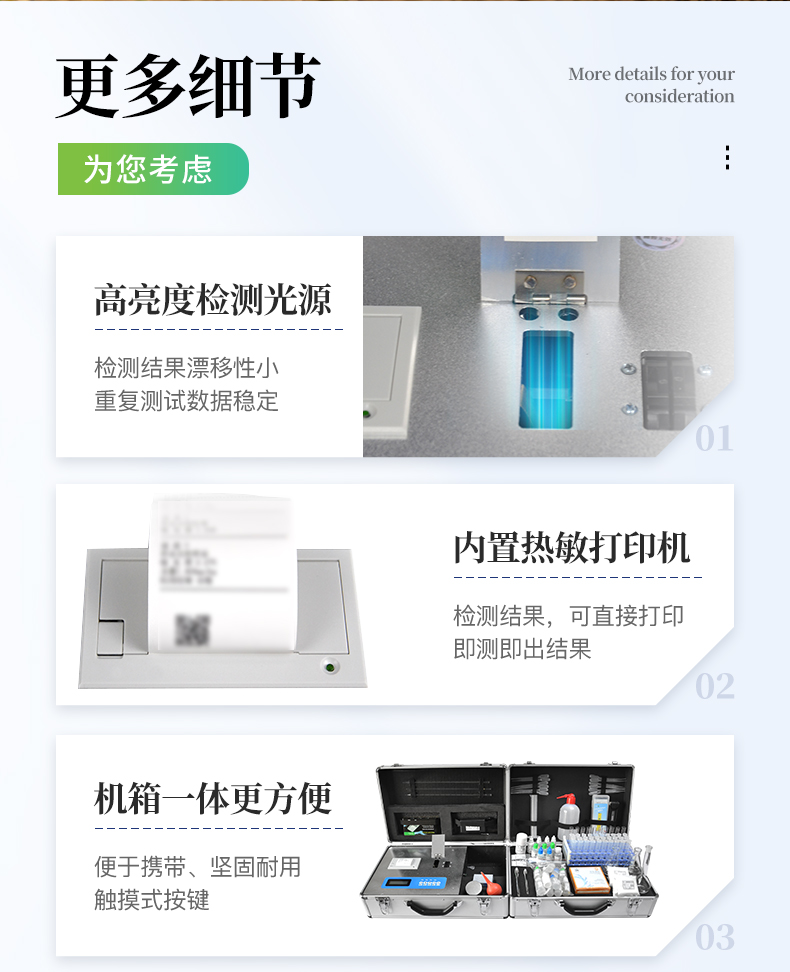★《機(jī)箱/藥劑一體式鋁合金機(jī)箱》設(shè)計(jì),便于攜帶、堅(jiān)固耐用,配套檢測(cè)方法及成品藥劑。