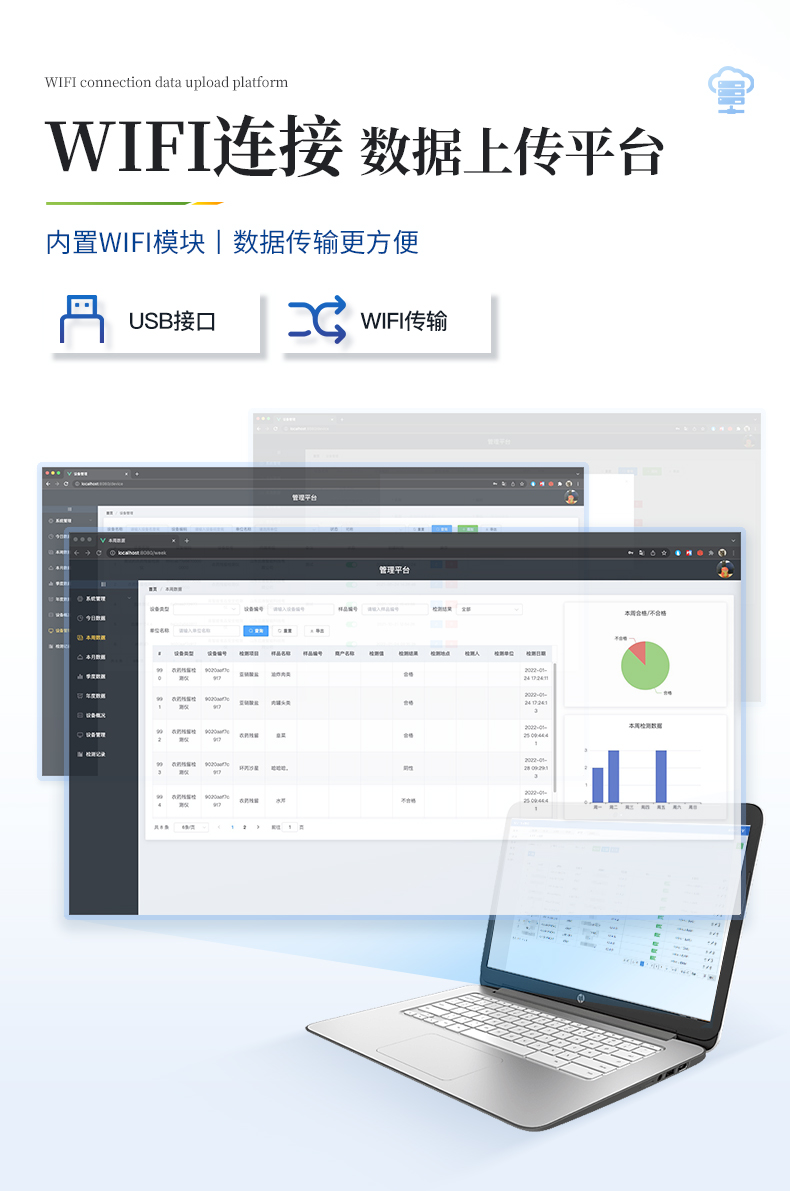 8.3、數(shù)據(jù)監(jiān)管系統(tǒng):同步對接監(jiān)管平臺,數(shù)據(jù)可局域網(wǎng)和互聯(lián)網(wǎng)數(shù)據(jù)上傳,檢測結(jié)果可選擇直接傳至食品安全監(jiān)管平臺。進(jìn)行區(qū)域食品安全監(jiān)管及大數(shù)據(jù)分析處理與數(shù)據(jù)統(tǒng)計,檢測區(qū)域食品安全長短期動態(tài),達(dá)到食品安全問題預(yù)估、預(yù)警。