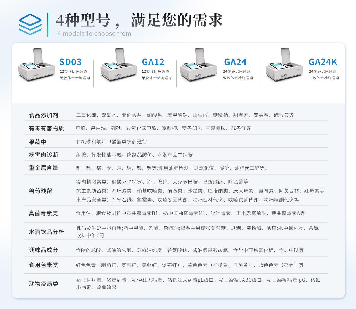 | 食品添加劑:二氧化硫、雙氧水、亞硝酸鹽、硝酸鹽、苯甲酸鈉、山梨酸鉀、糖精鈉、甜蜜素、木耳硫酸鎂等 | 有毒有害物質(zhì):甲醛、吊白塊、硼砂、過氧化苯甲酰、溴酸鉀、羅丹明B、三聚氰胺、蘇丹紅、工業(yè)堿、尿素、明礬等 | 果蔬:農(nóng)藥殘留(酶抑制率法) | 病害肉:組胺、揮發(fā)性鹽基氮 | 重金屬含量:鉛、鎘、鉻、汞、砷、錫、鎳、鋁等 | 水產(chǎn)品安全類:孔雀石綠、氯霉素、呋喃妥因、呋喃西林、呋喃它酮、呋喃唑酮等 | 瘦肉精激素類(獸藥):鹽酸克倫特羅、沙丁胺醇、萊克多巴胺、己烯雌酚等 | 抗生素殘留:四環(huán)素類、硝基呋喃類、磺胺類、β-興奮劑類、沙星類、磺胺類、喹諾酮類,甲砜霉素,氟苯尼考,金剛烷胺、替米考星、慶大霉素、林可霉素、鏈霉素、恩諾沙星、環(huán)丙沙星、頭孢啦啶、青霉素、阿莫西林等 | 真菌毒素類:食用油、糧食及飼料中黃曲霉毒素B1、黃曲霉毒素總量,奶中黃曲霉毒素M1、嘔吐毒素、玉米赤霉烯酮、赭曲霉毒素A、T2毒素、伏馬毒素等 | 水酒飲品分析:乳品及牛奶中蛋白質(zhì);酒中甲醇、乙醇、雜醇油;蜂蜜中果糖和葡萄糖、蔗糖、淀粉酶、酸度;水中氰化物、余氯,飲料中維C等 | 調(diào)味品成分: 食醋的總酸、醬油的總酸、芝麻油純度、谷氨酸鈉、醬油氨基酸態(tài)氮、食鹽中亞鐵氰化鉀、食鹽中碘等 | 食用色素類:紅色色素(胭脂紅、莧菜紅、莧菜紅)、黃色色素(檸檬黃、日落黃)、藍色色素(亮藍)等 | 動物疫病類:禽流感、新城疫、牛羊口蹄疫、牛羊結(jié)核病、牛羊包蟲、牛羊布病、小反芻獸、豬藍耳病毒、豬瘟病毒、豬偽狂犬病毒、豬細小、豬圓環(huán)、犬細小病毒、犬瘟熱病毒、犬狂犬病毒等 | 蜂蜜成分:果糖和葡萄糖、蔗糖、淀粉酶、酸度等 | 水產(chǎn)品安全類:孔雀石綠、氯霉素、呋喃妥因、呋喃西林、呋喃它酮、呋喃唑酮等 | 食用油脂:過氧化值、酸價等 | 蛋類藥物殘留:氯霉素,四環(huán)素,磺胺類,喹諾酮類,呋喃西林,呋喃它酮,呋喃妥因,呋喃唑酮,氟苯尼考,阿莫西林、頭孢氨芐、紅霉素、鏈霉素等 |