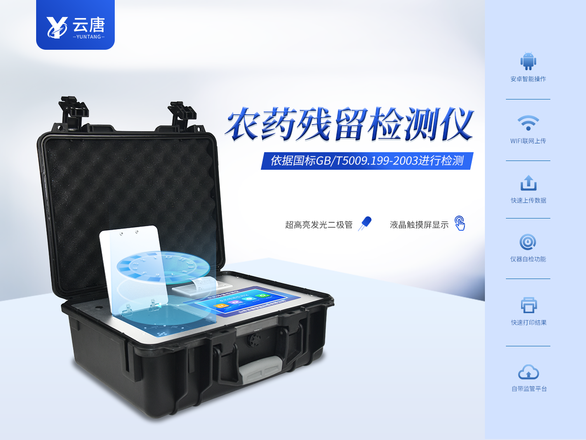 山東云唐智能科技有限公司生產(chǎn)的農(nóng)藥殘留檢測儀廣泛應(yīng)用于主要用于蔬菜、水果、茶葉、糧食、農(nóng)副產(chǎn)品等食品中農(nóng)藥殘留的快速檢測,依據(jù)國標(biāo)GB/T5009.199-2003進(jìn)行檢測,適用于果蔬茶生產(chǎn)基地以及農(nóng)貿(mào)批發(fā)銷售市場現(xiàn)場檢測,餐館、學(xué)校、食堂、家庭果蔬加工前的安全速測等。