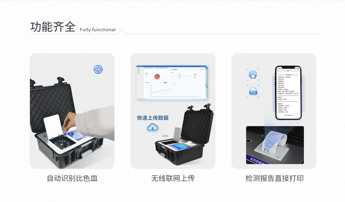 | 安卓智能操作系統(tǒng),采用更加**和人性化操作,儀器具有無線聯(lián)網(wǎng)上傳功能,快速上傳數(shù)據(jù),進(jìn)行數(shù)據(jù)統(tǒng)計和分析。 | 智能化程度高,儀器具有自檢功能:具有開機自檢和調(diào)零功能,具有自動檢測重復(fù)性功能;同時,檢測完成可自動打印檢測報告和二維碼。手機掃碼可顯示出詳細(xì)檢測信息。 | 儀器帶有監(jiān)管平臺,數(shù)據(jù)可局域網(wǎng)和互聯(lián)網(wǎng)數(shù)據(jù)上傳,檢測結(jié)果直接傳至食品安全監(jiān)管平臺。進(jìn)行區(qū)域食品安全監(jiān)管及大數(shù)據(jù)分析處理與數(shù)據(jù)統(tǒng)計,檢測區(qū)域食品安全長短期動態(tài),達(dá)到食品安全問題預(yù)估、預(yù)警 。 | 樣品處理簡單省力,整體操作快速、安全、便捷。 | 儀器具有自身保護(hù)功能,可設(shè)置用戶名及密碼,防止非工作人員操作等。 | 內(nèi)置強大的數(shù)據(jù)庫,可在儀器上直接選擇樣品名稱、檢測指標(biāo)、送檢單位等信息,也可在儀器上直接編輯錄入樣品名稱、檢測指標(biāo)、送檢單位等信息并保存進(jìn)樣品數(shù)據(jù)庫,方便后期操作調(diào)取使用。 | 儀器具有重新校準(zhǔn)、鎖定、恢復(fù)出廠設(shè)置功能。 |