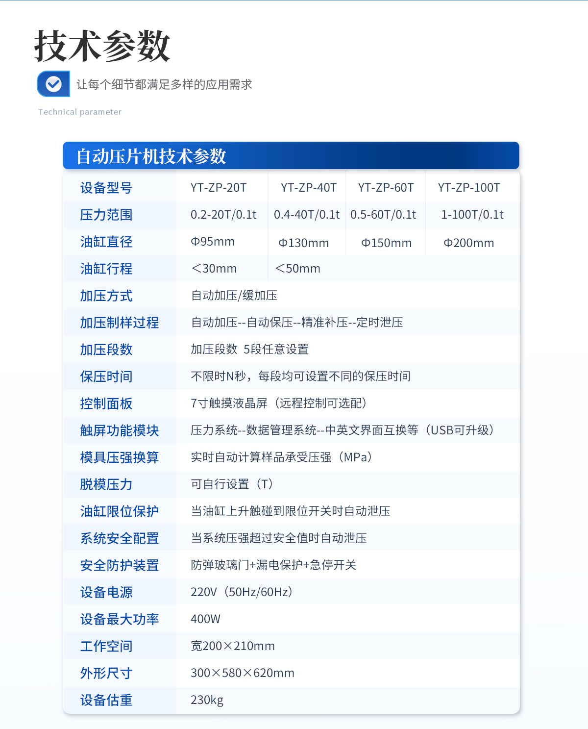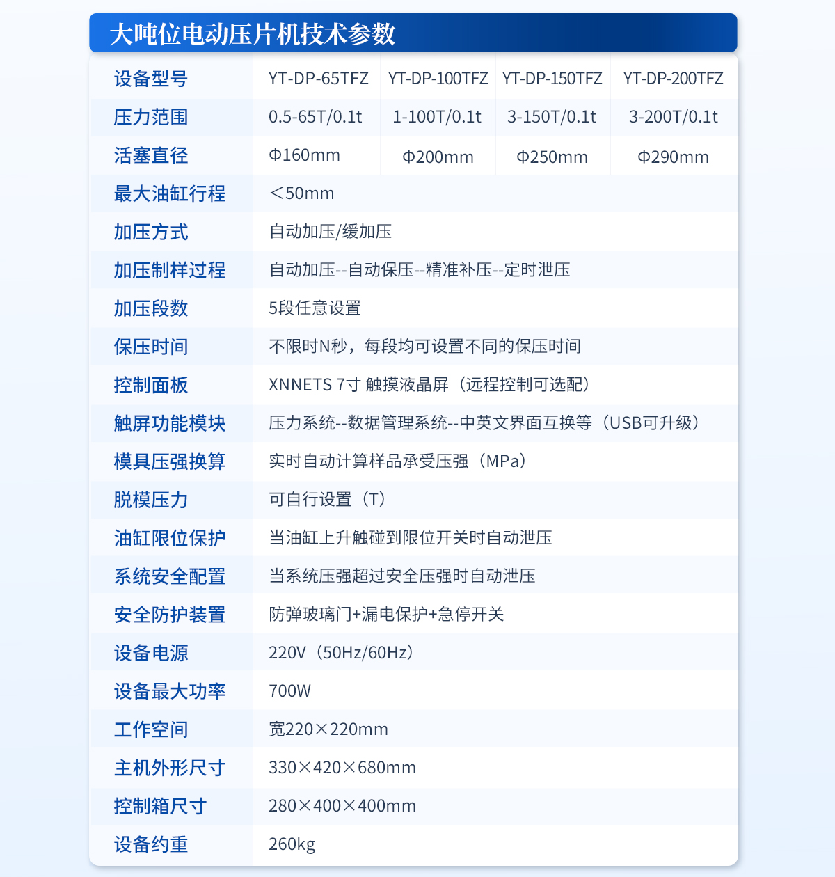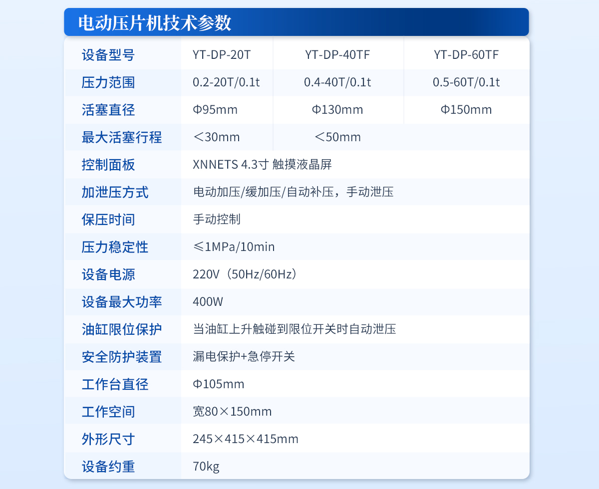| 設備型號:YT-ZP-40T | 壓力范圍:0.4-40T/0.1t | 油缸直徑:Ф130mm | 油缸行程 :<50mm | 加壓方式:自動加壓/緩加壓 | 加壓制樣過程:自動加壓--自動保壓--精準補壓--定時泄壓 | 加壓段數(shù):5段任意設置 | 保壓時間:不限時N秒,每段均可設置不同的保壓時間 | 控制面板:XNNETS 7寸 觸摸液晶屏(遠程控制可選配) | 觸屏功能模塊:壓力系統(tǒng)--數(shù)據管理系統(tǒng)--中英文界面互換等(USB可升級) | 模具壓強換算:實時自動計算樣品承受壓強(MPa) | 脫模壓力:可自行設置(T) | 油缸限位保護:當油缸上升觸碰到限位開關時自動泄壓 | 系統(tǒng)安全配置:當系統(tǒng)壓強超過安全值時自動泄壓 | 安全防護裝置:防彈玻璃門+漏電保護+急停開關 | 設備電源:220V(50Hz/60Hz) | 設備**功率:400W | 工作空間:寬160×180mm | 外形尺寸 :280×460×550mm | 設備估重 :110kg | 配置說明:壓片機1臺,模具選配!可根據需求定制壓片機或模具 |