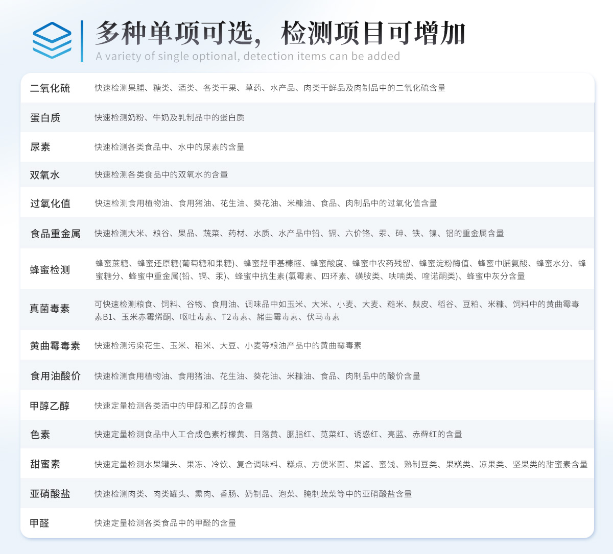 | 儀器采用臺(tái)式一體化系統(tǒng)檢測(cè)技術(shù),將分光光度模塊、新型農(nóng)殘檢測(cè)模塊、數(shù)字化管理模塊、無(wú)線通訊模塊高度集成于一體,支持檢測(cè)200種食品安全檢測(cè)項(xiàng)目,同時(shí)預(yù)留升級(jí)檢測(cè)方法。 | 儀器檢測(cè)模塊標(biāo)準(zhǔn)化、智能化,可隨意自由組合。檢測(cè)箱體內(nèi)置多個(gè)標(biāo)準(zhǔn)檢測(cè)單元,檢測(cè)模塊可以調(diào)整配置。 | 儀器采用全新安卓智能系統(tǒng),主控芯片采用 ARM Cortex-A7,RK3288/4核處理器,10.1寸高清液晶觸摸豎屏,更加**的UI交互界面,運(yùn)轉(zhuǎn)快捷;儀器配備無(wú)線通信模塊: 4G(APN)通訊模塊、Wifi模塊,藍(lán)牙傳輸,同時(shí)具有雙USB接口以及RJ45接口能以多種方式實(shí)現(xiàn)數(shù)據(jù)保存和數(shù)據(jù)傳輸功能。 | 創(chuàng)新檢測(cè)模式: | ★檢測(cè)通道:≥12通道;采用精密旋轉(zhuǎn)比色池設(shè)計(jì),使用同芯片同光源校準(zhǔn)精度,解決不同光源之間的誤差值。1-12通道間誤差0.1%。(***:**202022821055.2) | ★儀器具有自動(dòng)識(shí)別比色皿檢測(cè)功能,即:將樣品比色皿放入儀器后,點(diǎn)擊樣品檢測(cè),儀器自動(dòng)識(shí)別比色皿進(jìn)行通道檢測(cè)。 | 進(jìn)口高精光源: | 高精度進(jìn)口四波長(zhǎng)冷光源,通道配置 410、520、590、630nm 波長(zhǎng)光源,一個(gè)光源芯片驅(qū)動(dòng)一個(gè)光源,誤差極小,每臺(tái)設(shè)備單獨(dú)**校準(zhǔn)光源,**比對(duì),同時(shí)參照四種不同波段光源全方位覆蓋市面上99%的農(nóng)殘食品項(xiàng)目檢測(cè)。 | 智能化操作系統(tǒng): | 便捷操作系統(tǒng):設(shè)備檢測(cè)時(shí)可在同一檢測(cè)界面自動(dòng)對(duì)應(yīng)相關(guān)檢測(cè)通道一次性選擇1-12個(gè)樣品名稱(chēng),無(wú)須退出界面,節(jié)省操作時(shí)間。 | 數(shù)據(jù)集成系統(tǒng):設(shè)備首頁(yè)自動(dòng)統(tǒng)計(jì)檢測(cè)數(shù)據(jù)包含:周檢測(cè)數(shù)據(jù)、月檢測(cè)數(shù)據(jù),全部檢測(cè)總數(shù)量,均包含檢測(cè)總數(shù),合格數(shù),不合格數(shù),以及相關(guān)柱形分析圖,對(duì)各項(xiàng)檢測(cè)數(shù)據(jù)清晰掌握,無(wú)需電腦查詢(xún),更加快捷直觀。 | 項(xiàng)目預(yù)設(shè)系統(tǒng):支持添加單個(gè)及多個(gè)相同或不相同的任務(wù)預(yù)設(shè),一鍵快速調(diào)取,每一個(gè)任務(wù)分別可以設(shè)置不同的樣品、批次、編號(hào)、來(lái)源、備注、抽樣信息、檢測(cè)信息、受檢信息、復(fù)核信息等更多信息。無(wú)縫鏈接平臺(tái)和APP實(shí)時(shí)查看下發(fā)任務(wù)。 | 數(shù)據(jù)監(jiān)管系統(tǒng):同步對(duì)接監(jiān)管平臺(tái),數(shù)據(jù)可局域網(wǎng)和互聯(lián)網(wǎng)數(shù)據(jù)上傳,檢測(cè)結(jié)果可選擇直接傳至食品安全監(jiān)管平臺(tái)。集成OSS輸出存儲(chǔ)服務(wù)、區(qū)分設(shè)備定向管理應(yīng)用,進(jìn)行區(qū)域食品安全監(jiān)管及大數(shù)據(jù)分析處理與數(shù)據(jù)統(tǒng)計(jì),檢測(cè)區(qū)域食品安全長(zhǎng)短期動(dòng)態(tài),達(dá)到食品安全問(wèn)題預(yù)估、預(yù)警。 | 自定義打印系統(tǒng):內(nèi)置全新打印系統(tǒng),新創(chuàng)自定義打印方式,可按需靈活設(shè)置開(kāi)啟或關(guān)閉:產(chǎn)品合格證(國(guó)家農(nóng)業(yè)部標(biāo)準(zhǔn)要求),二維碼,抽樣信息、檢測(cè)信息,受檢信息、復(fù)核信息、抽樣日期、檢測(cè)日期等信息的打印。 | 系統(tǒng)遠(yuǎn)程更新功能:可定向分客戶(hù)分儀器更新系統(tǒng),按照不同客戶(hù)后期實(shí)際需求添加項(xiàng)目,無(wú)需機(jī)器返廠,即可遠(yuǎn)程實(shí)時(shí)升級(jí)全新系統(tǒng),節(jié)省時(shí)間成本及避免運(yùn)輸造成設(shè)備損壞。 | 儀器主機(jī)采用一體化防水、抗壓、防撞擊、防腐蝕箱體設(shè)計(jì),同時(shí)配備交直流供電,可連接車(chē)載電源,可選配大容量充電鋰電池,滿(mǎn)足現(xiàn)場(chǎng)野外檢測(cè)需求。 | 安全證書(shū),放心保障:儀器具有中國(guó)計(jì)量科學(xué)研究院校準(zhǔn)證書(shū),權(quán)威認(rèn)證。 |