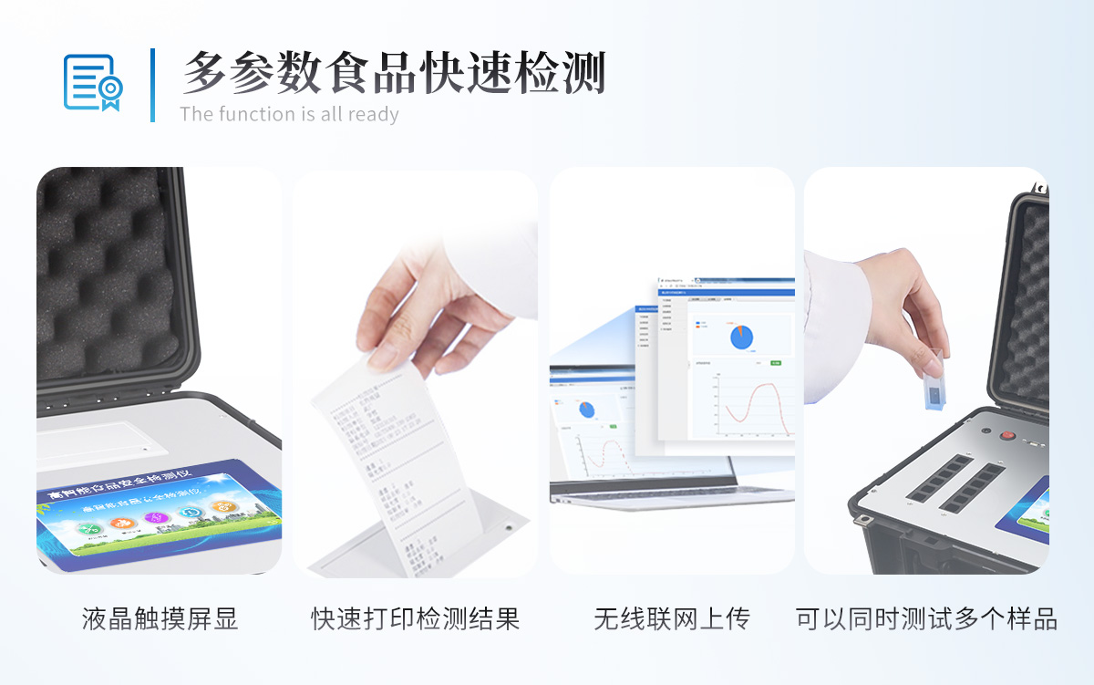 多功能食品安全檢測儀可快速檢測200多項目,包含非食用化學(xué)物質(zhì)、濫用食品添加劑、農(nóng)藥殘留、獸藥殘留、重金屬、病害肉、營養(yǎng)強化劑、抗生素類殘留、激素類殘留、真菌毒素類殘留、化學(xué)類殘留等現(xiàn)場的定性定量檢測。該多功能食品安全檢測儀為集成化食品安全快速檢測分析設(shè)備,廣泛應(yīng)用于市場監(jiān)管局、檢測中心、衛(wèi)生監(jiān)督部門、農(nóng)業(yè)部門、院校及各單位食堂、食品肉產(chǎn)品深加工企業(yè)、商超市場、司法部門、餐飲機構(gòu)、養(yǎng)殖場、屠宰場、檢驗檢疫部門等單位使用。