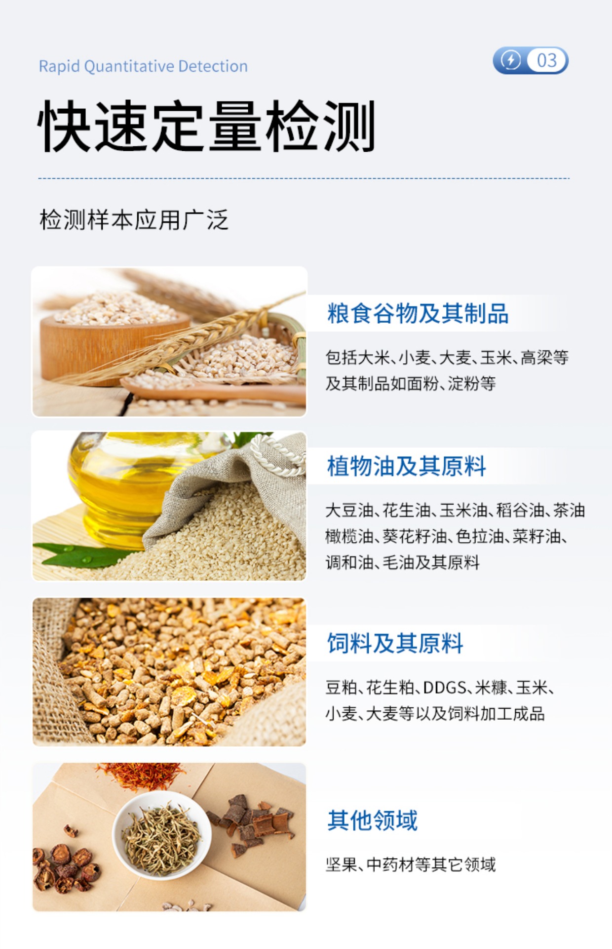 | 重金屬鎘 | 0-1000ug/kg | 玉米、小麥、麥麩、豆粕、花生粕、玉米胚芽粕、膨化玉米、DDGS、噴漿玉米皮及成品飼料 |