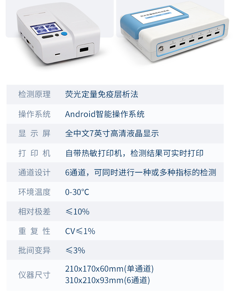 | 一體化設計,集成孵育和檢測功能同時進行,孵育完成直接檢測; | 全中文 7英寸高清液晶顯示,觸摸屏操作; | Android 系統(tǒng),支持在線升級,可WIFI聯(lián)網(wǎng); | 檢測原理:熒光定量免疫層析法; | 6通道設計,可同時進行一種或多種指標的檢測,6個獨立檢測單元,檢測效率高,并且互不干擾; | 具有二維碼自動識別系統(tǒng),可直接識別檢測項目、檢測流程等信息; | 儀器自帶熱敏打印機,檢測結果可實時打?。?/td> | 具有檢測數(shù)據(jù)存儲(存儲數(shù)量不少于 10000 條)、查詢、批量數(shù)據(jù)處理和打印功能; | 儀器≥2 個USB 接口,可拷貝結果及原始數(shù)據(jù),具有 wifi 接入模塊,可通過無線連接網(wǎng) 絡實現(xiàn)數(shù)據(jù)上傳; | 分鐘內(nèi)達到工作狀態(tài)(37℃),封閉系統(tǒng),不受外界環(huán)境(光、熱)干擾,工作環(huán)境溫度:0-30℃; | 真菌毒素和重金屬可同時進行前處理,并同時上機檢測; | 儀器配備全套前處理設備,拉桿箱設計,即可用于實驗室檢測可以外出攜帶檢測 | 相對極差≤10%; | 重復性 CV≤1%; | 批間變異≤3%; | 尺寸310x210x93mm |