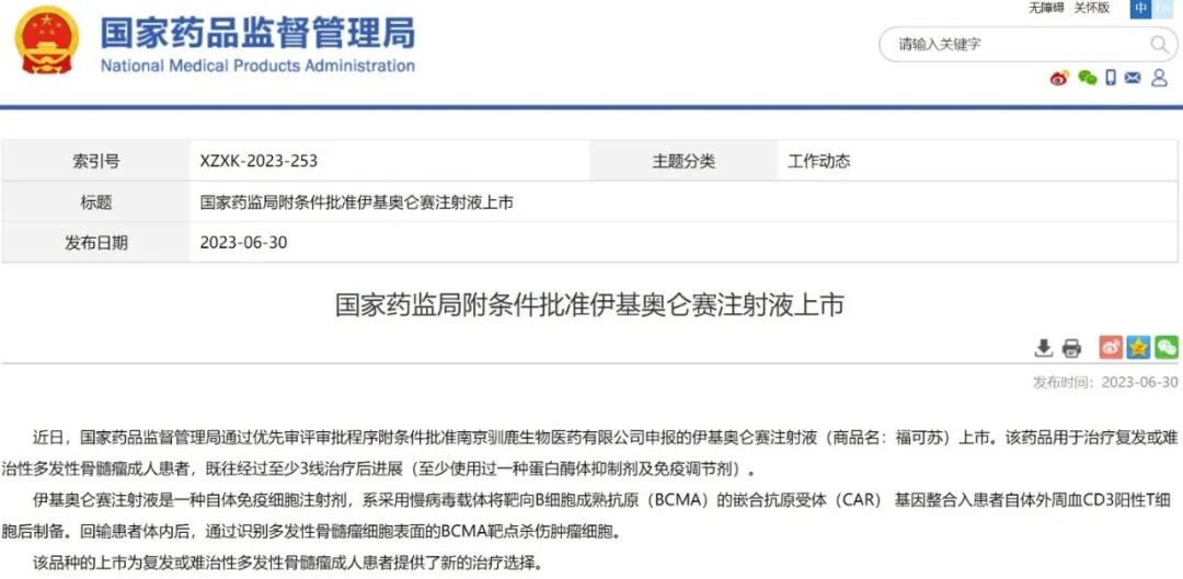 2023年6月30日,中國國家藥監局(NMPA)官網最新公示,馴鹿生物開發的全人源BCMA靶向CAR-T產品伊基奧侖賽注射液(曾用名:伊基侖賽注射液)獲批上市,用于治療復發或難治性多發性骨髓瘤(MM)成人患者,既往經過至少3線治療后進展(至少使用過一種蛋白酶體抑制劑及免疫調節劑)。