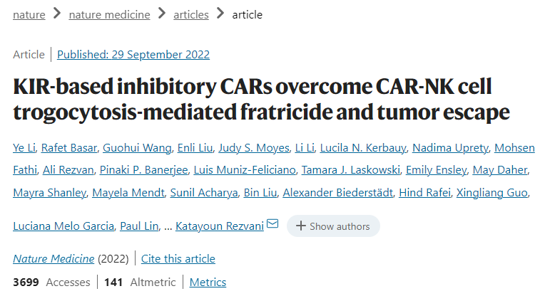 2022年7月,德克薩斯大學(xué)MD安德森癌癥中心的研究人員在Nature Medicine上發(fā)表了一篇文章報(bào)道了一種。研究人員發(fā)現(xiàn)“胞啃”的生理過(guò)程通過(guò)引起腫瘤抗原丟失、NK細(xì)胞衰竭和自相殘殺,促成了腫瘤逃逸和CAR-NK細(xì)胞治療后反應(yīng)不佳。在這一過(guò)程中,靶細(xì)胞表面蛋白會(huì)轉(zhuǎn)移到免疫細(xì)胞表面以引發(fā)自相殘殺的現(xiàn)象。
