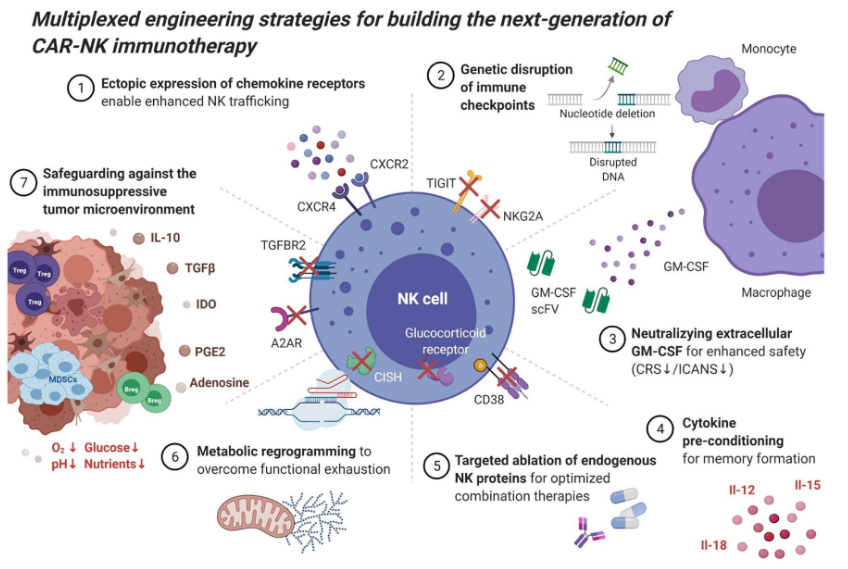 這些“下一代”CAR-NK療法主要采用了7大工程化策略以提升持久性和抗腫瘤活性: