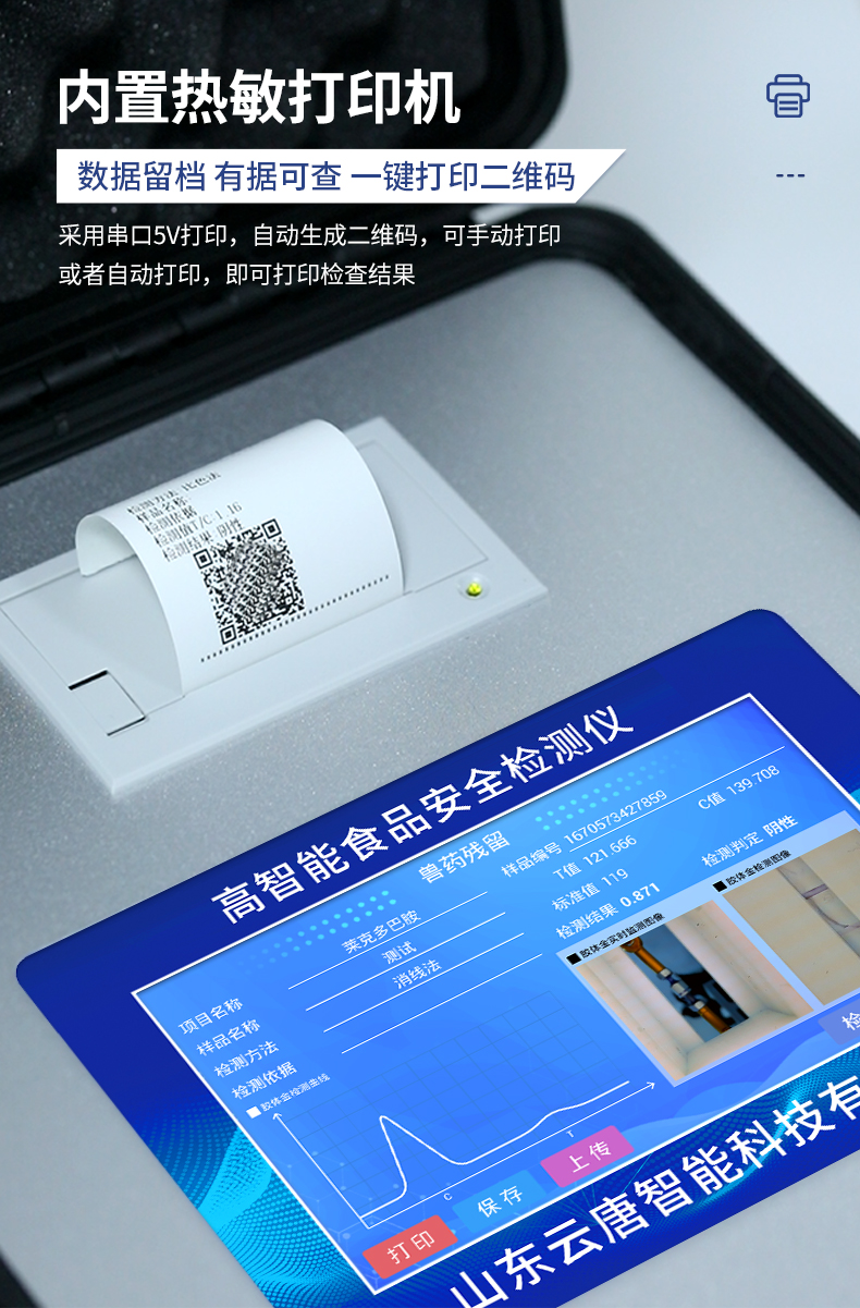 | 安卓智能操作系統(tǒng),采用更加**的UI交互界面,儀器具有wifi聯(lián)網(wǎng)上傳、4G聯(lián)網(wǎng)傳輸、GPRS無(wú)線遠(yuǎn)傳、網(wǎng)線連接功能,快速批量上傳數(shù)據(jù)。 | 智能化程度高,儀器具有自檢功能:具有開機(jī)自檢和調(diào)零功能,具有自動(dòng)檢測(cè)重復(fù)性功能。 | 新一代高速熱敏打印機(jī),檢測(cè)完成可自動(dòng)打印或批量打印檢測(cè)報(bào)告和二維碼。 | 儀器帶有監(jiān)管平臺(tái),數(shù)據(jù)可局域網(wǎng)和互聯(lián)網(wǎng)數(shù)據(jù)上傳,檢測(cè)結(jié)果直接傳至食品安全監(jiān)管平臺(tái)。進(jìn)行區(qū)域食品安全監(jiān)管及大數(shù)據(jù)分析處理與數(shù)據(jù)統(tǒng)計(jì),檢測(cè)區(qū)域食品安全長(zhǎng)短期動(dòng)態(tài),達(dá)到食品安全問(wèn)題預(yù)估、預(yù)警 | 一體化主機(jī),包含食品安全檢測(cè)模塊、多通道農(nóng)藥殘留檢測(cè)模塊、膠體金免疫層析檢測(cè)模塊。 | 一體化便攜式快檢設(shè)備,滿足現(xiàn)場(chǎng)及流動(dòng)檢測(cè)使用需求,能夠在同一軟件下實(shí)現(xiàn)所有檢測(cè)項(xiàng)目的檢測(cè),并可通過(guò)同一窗口直觀顯示檢測(cè)結(jié)果。 | 膠體金模塊檢測(cè)方式:軌道式自動(dòng)傳輸掃描,檢測(cè)完成后自動(dòng)退出檢測(cè)卡。 | 食品安全檢測(cè)儀CT線自動(dòng)識(shí)別,無(wú)需手動(dòng)調(diào)整,檢測(cè)完成自動(dòng)顯示CT坐標(biāo)曲線。 | 內(nèi)置強(qiáng)大的數(shù)據(jù)庫(kù),具有多品類多種類樣品菜單功能,可靈活選擇檢測(cè)樣品,不同的檢測(cè)通道可同時(shí)檢測(cè)不同的樣品項(xiàng)目。也可在儀器上直接編輯錄入樣品名稱、檢測(cè)指標(biāo)、送檢單位等信息并保存進(jìn)樣品數(shù)據(jù)庫(kù)。 | 產(chǎn)品內(nèi)置操作演示視頻,是您身邊的化驗(yàn)指導(dǎo)專家。 | 樣品處理簡(jiǎn)單省力,整體操作快速、安全、便捷。 | 儀器具有自身保護(hù)功能,可設(shè)置用戶名及密碼,防止非工作人員操作等。 | 高靈敏度,高檢測(cè)精度,高重復(fù)性精度,掃描式高精度光學(xué)傳感器。 | 結(jié)果判定線可修改,對(duì)照值標(biāo)定值可保存,斷電不丟失數(shù)據(jù)。 | 兼容市場(chǎng)上所有的膠體金卡,使用耗材不受限制,極大增強(qiáng)用戶使用體驗(yàn)。 | 儀器具有重新校準(zhǔn)、鎖定、恢復(fù)出廠設(shè)置功能。 |