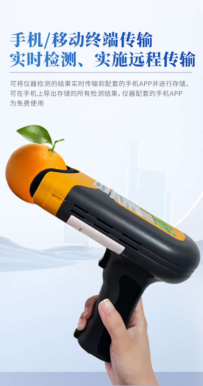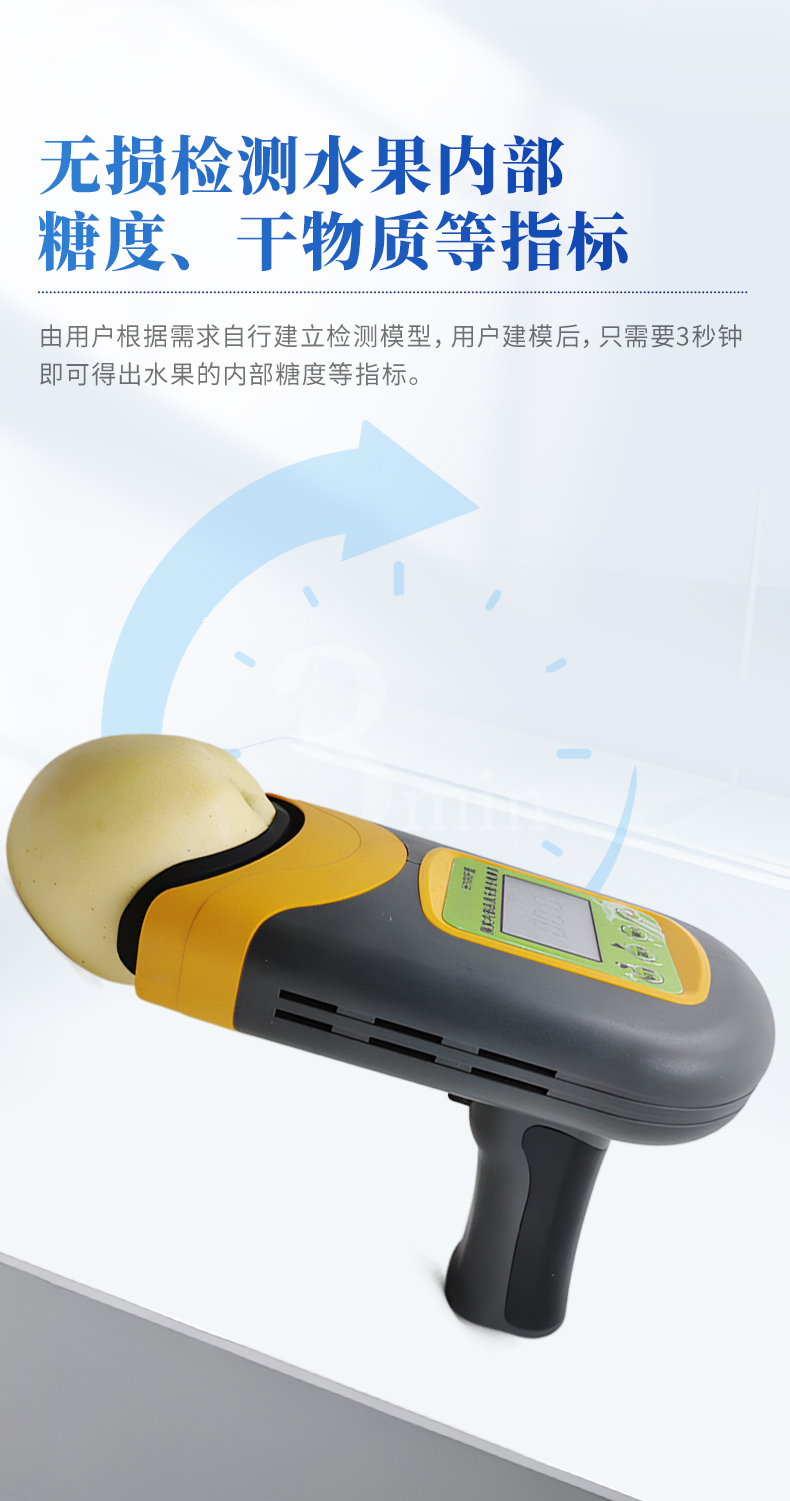 果實內(nèi)部品質(zhì)無損檢測儀是一款便攜式的果實質(zhì)量檢測儀,可以方便的檢測水果內(nèi)部的糖度、干物質(zhì)等指標(biāo),由用戶根據(jù)需求自行建立檢測模型,用戶建模后,只需要3秒鐘即可得出水果的內(nèi)部糖度等指標(biāo)。儀器內(nèi)置可充電鋰電池,單次充滿后可連續(xù)檢測2000次,檢測結(jié)果實時顯示在設(shè)備屏幕上,用戶可以通過數(shù)據(jù)線將檢測數(shù)據(jù)上傳到電腦中。