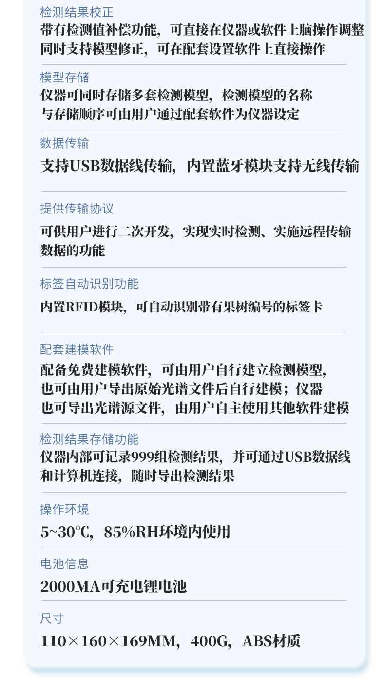 | 1.檢測波長:650~950nm; | 2.光源:2個鹵素?zé)簦?/td> | 3.檢測方式:漫反射式; | 4.可檢測水果:根據(jù)以下選型表選擇 | 5.適配水果大?。ü麖剑篐100F型(40-120mm),H100C型(30-80mm),H100M型(瓜類) | 6.檢測項目: a.糖度(可溶性固形物SSC) b.干物質(zhì) c.水分 備注:實際可檢測項目隨果品種類不同而有區(qū)別 | 7.檢測時間:3秒顯示結(jié)果; | 8.電源:充滿電后可連續(xù)檢測2000次,附帶直流12V/3A充電器; | 9.精度:糖度檢測精度±0.5%,干物質(zhì)檢測精度±0.5%,具體表現(xiàn)由果品特性和建模效果決定; | 10.檢測結(jié)果校正:帶有檢測值補(bǔ)償功能,可直接在儀器或軟件上腦操作調(diào)整;同時支持模型修正,可在配套設(shè)置軟件上直接操作; | 11.模型存儲:儀器可同時存儲多套檢測模型,檢測模型的名稱與存儲順序可由用戶通過配套軟件為儀器設(shè)定; | 12.數(shù)據(jù)傳輸:支持USB數(shù)據(jù)線傳輸,內(nèi)置藍(lán)牙模塊支持無線傳輸; | 13.手機(jī)/移動終端傳輸功能:可將儀器檢測的結(jié)果實時傳輸?shù)脚涮椎氖謾C(jī)APP并進(jìn)行存儲,可在手機(jī)上導(dǎo)出存儲的所有檢測結(jié)果,儀器配套的手機(jī)APP為免費(fèi)使用; | 14.提供傳輸協(xié)議,可供用戶進(jìn)行二次開發(fā),實現(xiàn)實時檢測、實施遠(yuǎn)程傳輸數(shù)據(jù)的功能; | 15.標(biāo)簽自動識別功能:內(nèi)置RFID模塊,可自動識別帶有果樹編號的標(biāo)簽卡; | 16.支持光譜信息存儲和導(dǎo)出; | 17.配套建模軟件:配備免費(fèi)建模軟件,可由用戶自行建立檢測模型,也可由用戶導(dǎo)出原始光譜文件后自行建模;儀器也可導(dǎo)出光譜源文件,由用戶自主使用其他軟件建模; | 18.檢測結(jié)果存儲功能:儀器內(nèi)部可記錄999組檢測結(jié)果,并可通過USB數(shù)據(jù)線和計算機(jī)連接,隨時導(dǎo)出檢測結(jié)果; | 19.操作環(huán)境:5~30℃,85%RH環(huán)境內(nèi)使用 | 20.顯示屏:LCD液晶屏 | 21.電池信息:2000mA可充電鋰電池 | 22.尺寸:110×160×169mm,400g,ABS材質(zhì) | 23.附件:橡膠遮光罩,充電器,USB數(shù)據(jù)線,便攜箱,軟件(免費(fèi)電子版) |