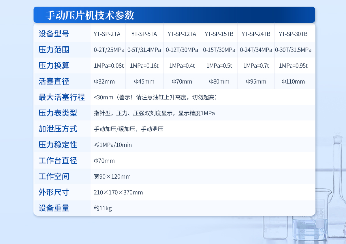 | 設(shè)備型號:YT-ZP-100T | 壓力范圍:1-100T/0.1t | 油缸直徑:Ф200mm | 油缸行程 :<50mm | 加壓方式:自動加壓/緩加壓 | 加壓制樣過程:自動加壓--自動保壓--精準(zhǔn)補(bǔ)壓--定時泄壓 | 加壓段數(shù):5段任意設(shè)置 | 保壓時間:不限時N秒,每段均可設(shè)置不同的保壓時間 | 控制面板:XNNETS 7寸 觸摸液晶屏(遠(yuǎn)程控制可選配) | 觸屏功能模塊:壓力系統(tǒng)--數(shù)據(jù)管理系統(tǒng)--中英文界面互換等(USB可升級) | 模具壓強(qiáng)換算:實時自動計算樣品承受壓強(qiáng)(MPa) | 脫模壓力:可自行設(shè)置(T) | 油缸限位保護(hù):當(dāng)油缸上升觸碰到限位開關(guān)時自動泄壓 | 系統(tǒng)安全配置:當(dāng)系統(tǒng)壓強(qiáng)超過安全值時自動泄壓 | 安全防護(hù)裝置:防彈玻璃門+漏電保護(hù)+急停開關(guān) | 設(shè)備電源:220V(50Hz/60Hz) | 設(shè)備**功率:400W | 工作空間: 寬200×210mm | 外形尺寸 :300×580×620mm | 設(shè)備估重 :230kg | 配置說明:壓片機(jī)1臺,模具選配!可根據(jù)需求定制壓片機(jī)或模具 |